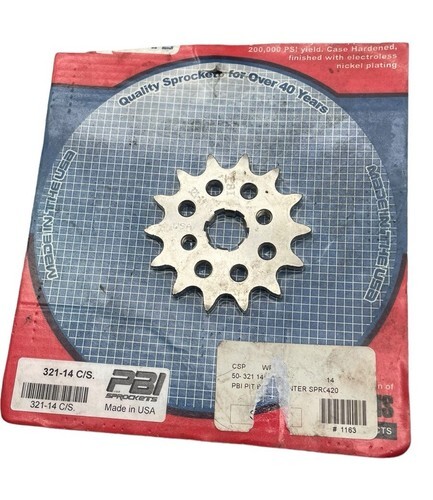 PBI Counter Shaft Sprocket Steel Front 14T 321-14 Made in the USA New in sealed packaging - package has some storage/shelf wear and soiling but sprocket is protected and fine. The photos are useful for seeing condition and other details.