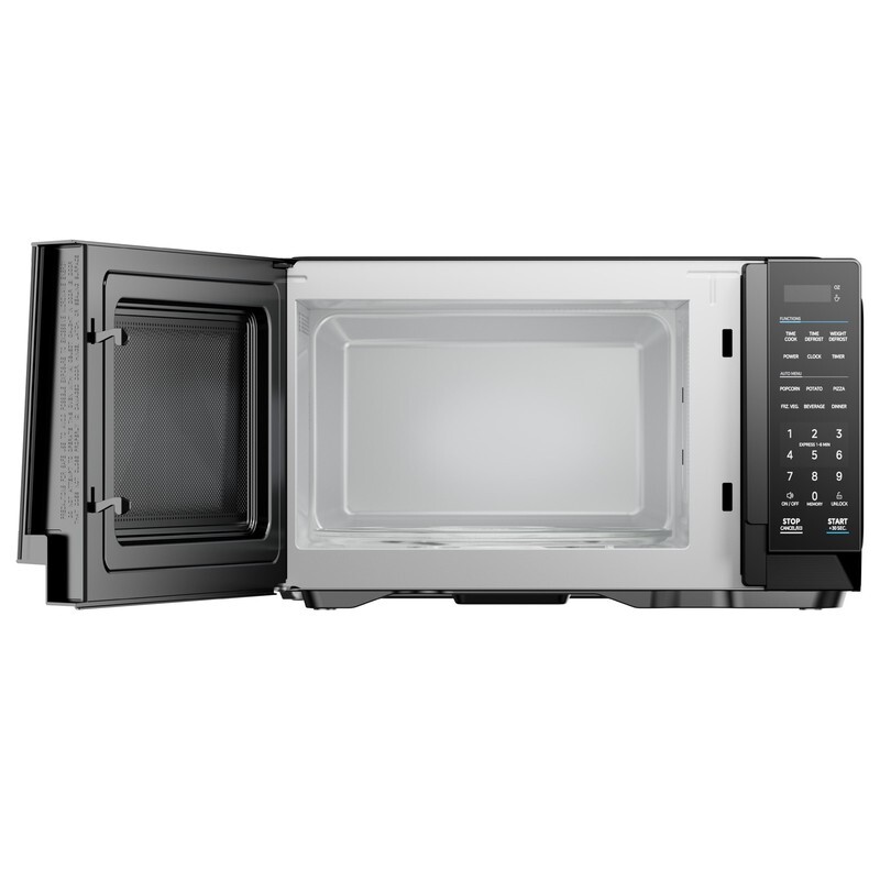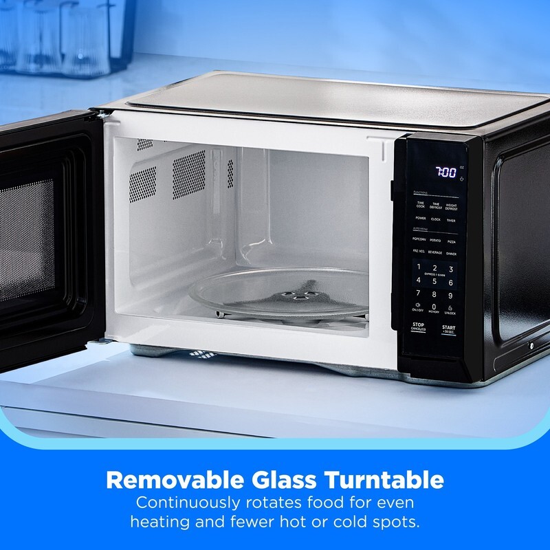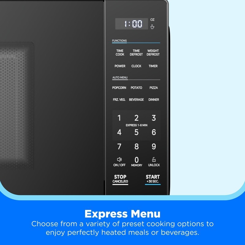 ?0.9 cu ft Black countertop microwave oven ideal for dorms, apartments, and small kitchens 900W microwave oven with 11 adjustable power levels for flexible cooking Express Cook small microwave oven with 1?6 minute one-touch buttons Microwave with defrost by weight and time for evenly thawed frozen food +30 Seconds Quick Start microwave adds instant time to any cooking cycle ECO Mode microwave oven saves energy by reducing standby power consumption Quiet Mode microwave allows silent use, perfect for shared living or late nights Multi-stage cooking microwave oven automatically adjusts power for better results Rotating glass turntable microwave ensures food heats evenly every time Child safety lock microwave oven helps prevent unintended use and accidents