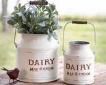Here is a new pair of farmhouse design metal decoativer buckets,these are made of metal and have attached metal handles that fold up and down for easy storage, they both have a distressed white finish and will have marks and spots in finish, are made this way, they both read Dairy Milk and Cream on them on the fronts and the larger one measures 10 inch in diameter by 10 3/4 inch high and the smaller one measures 7 inch in diameter by 10 3/4 inch high. Nice pair of buckets,And check out my many other nice decor and lighting.