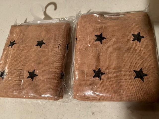 Here are 2 new Heirloom Printed Star Panels, they each measures 40" x 63" and can hang straight or be pulled up, this listing is for 2 panels, Made of 100% cotton with an all over printed black star pattern, fabric drapes beautifully and adds the finishing touch to any window. Unlined to allow light to filter through. Nice rustic window panels and these DO NOT have tie backs with them