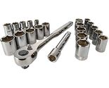 WHAT'S INCLUDED: (9) 1/2-in. Drive Shallow 12 PT Sockets MM - 14, 15, 16, 17, 18, 19, 20, 21, 22MM (10) 1/2-in. Drive Shallow 12 PT Sockets SAE - 3/8-in. , 7/16-in. , 1/2-in. . 9/16-in. , 5/8-in. , 11/16-in. , 3/4-in. , 13/16, 7/8-in. , 15/16-in. (1) 1/2-in. Drive Universal Joint (1) 1/2-in. Drive Ext Bar - 5-in. (1) 120-Tooth 3/8-in. Ratchet