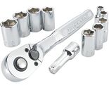 Craftsman 11 piece Metric Socket Wrench Set comes with nine sockets of varying sizes (5, 6, 7, 8, 9, 10, 11, 12 and 13 mm), a 1/4 inch drive ratchet and a 1-1/2 inch extension bar all neatly organized in a durable black plastic case, which clearly marks the socket sizes in easy to read raised numerals.