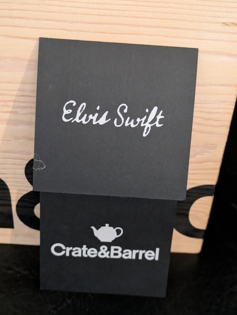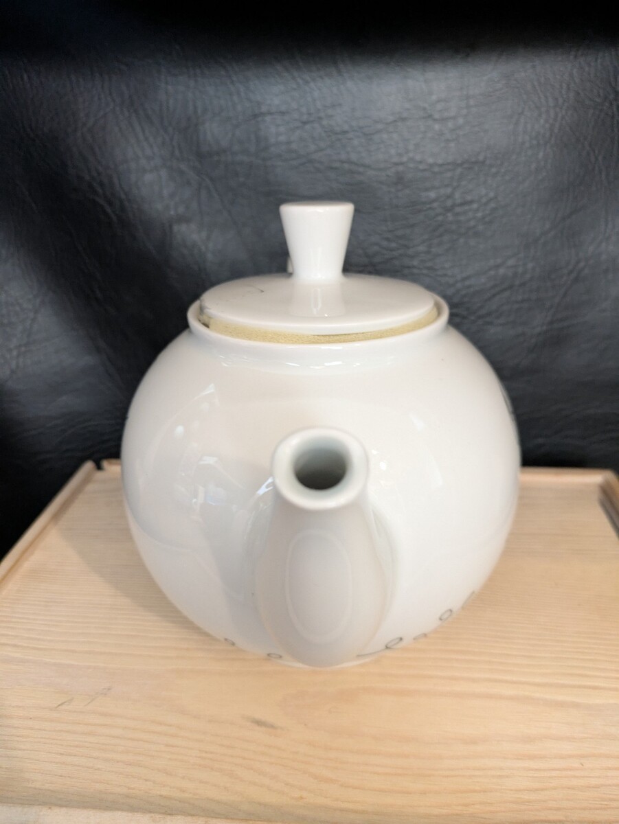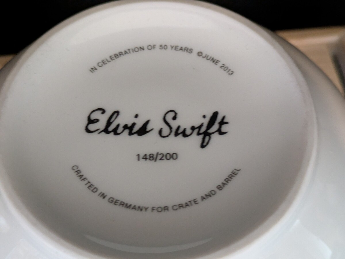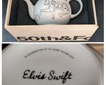 The product is a limited edition 50th anniversary Elvis Swift cat and dog teapot by Crate Barrel. This white porcelain teapot features a whimsical dog and cat design, making it a unique and collectible piece for any tea enthusiast or lover of pets. It comes in a glossy finish with a black and white color scheme, and is handmade in Germany. The teapot is both stylish and functional, perfect for serving tea on any occasion with a contemporary flair. It includes a lid and is packaged in a wood box, adding to its charm and value as a special item for collectors.