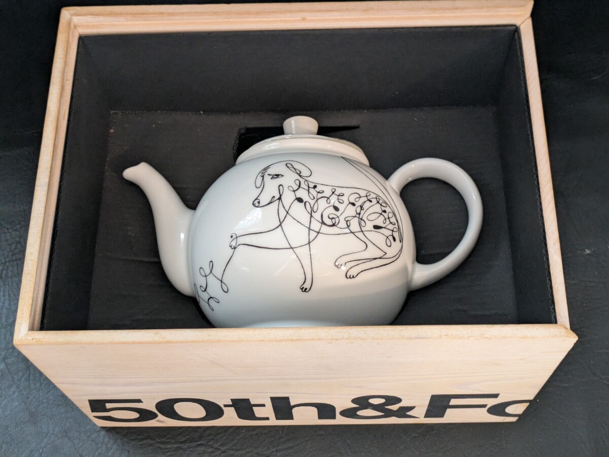 Crate & Barrel Elvis Swift Cat Dog Teapot 7 of 200 50th Anniversary Wood Box NEW