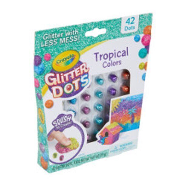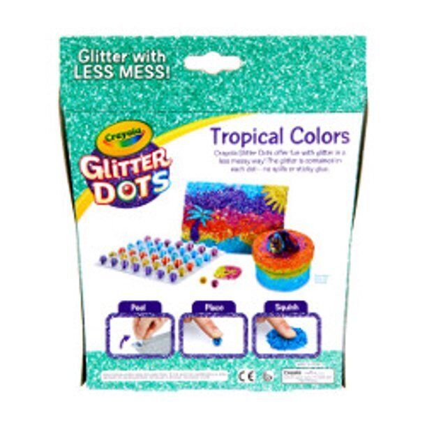 Crayola Glitter Dots Kit Tropical Colors Child Unisex Glitter With Less 42 Count Crayola Glitter Dots offer all the fun of glitter and way less mess! CRAYOLA: Crayola Glitter Dots LESS MESS: Offer all the fun of glitter and way less mess! SPECIALTY: The glitter is contained in each dot--no spills or sticky glue! CONTAINS: This package contains 42 dots in our beautiful tropical colors USERS: Perfect for arts and crafts and school projects! Beginner boys and girls, ages 5 and up recommended Perfect for arts and crafts and school projects! Ages 5 and up recommended.