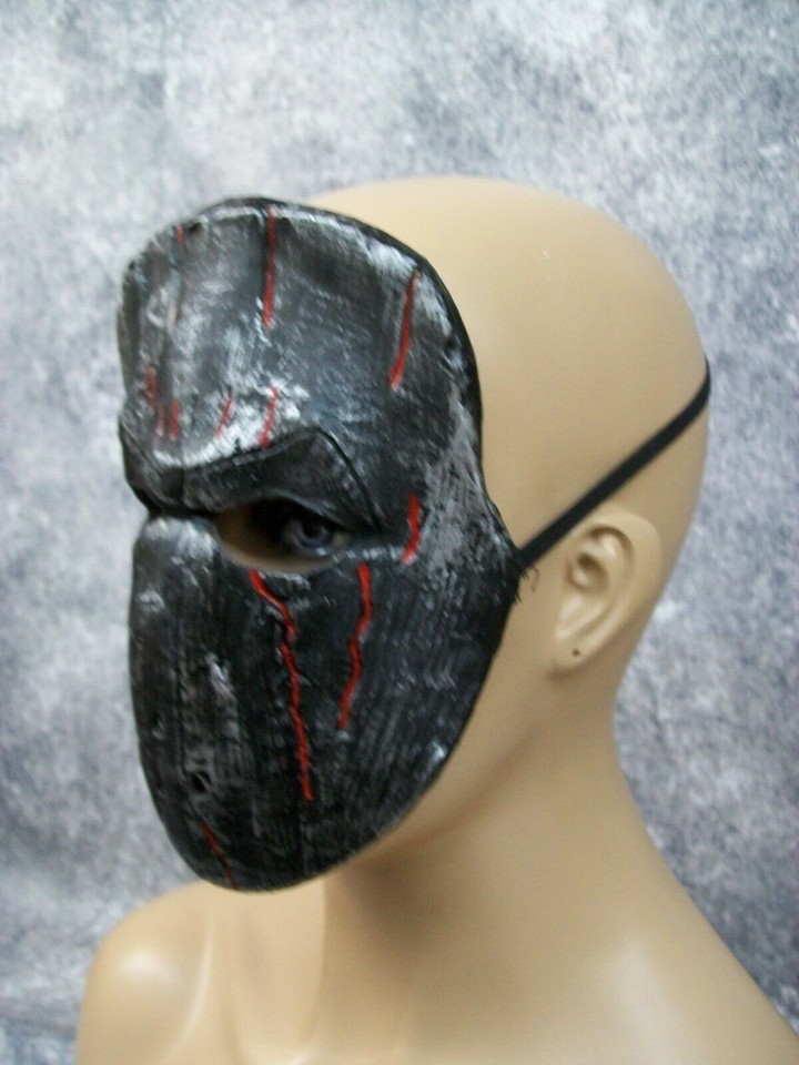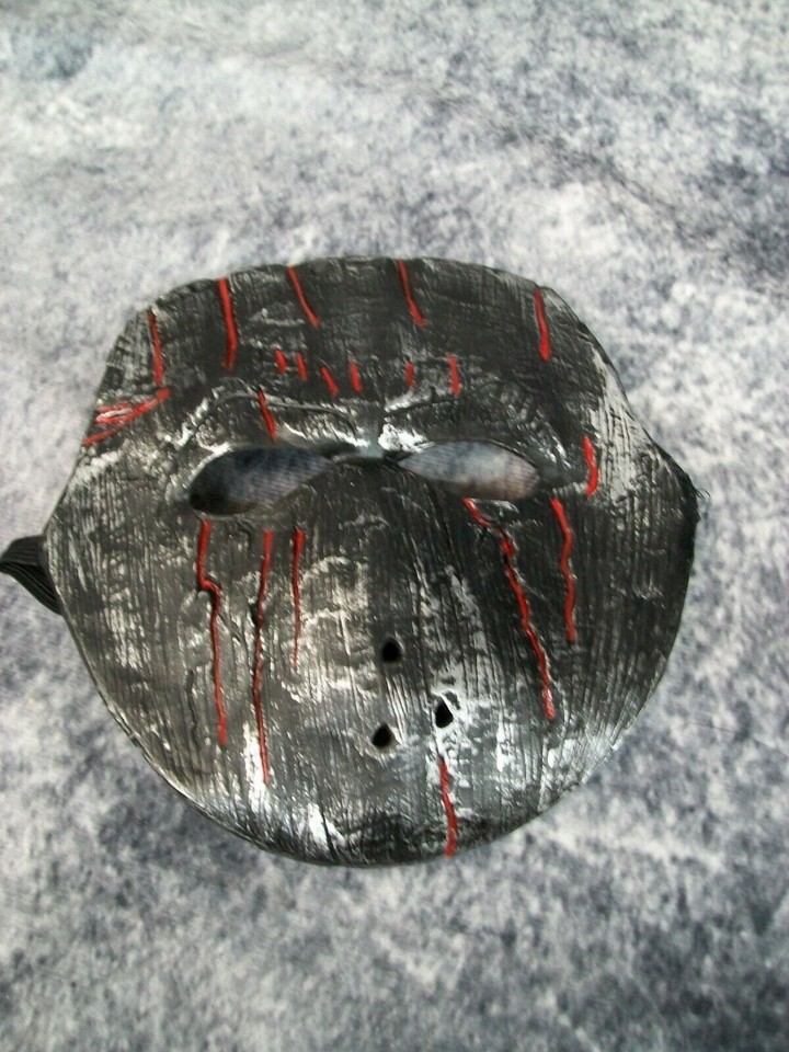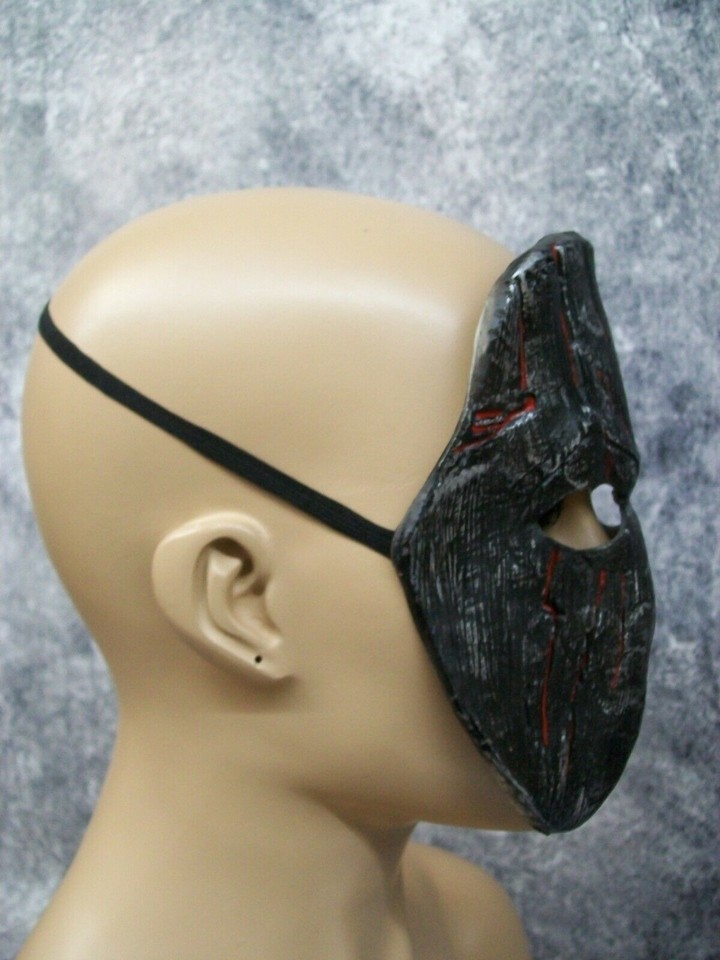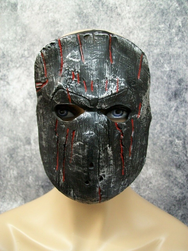 Lightweight Vinyl Costume Face Mask. Eerie Face. Creepy Cracked Metal or Stone like face with drilled holes over mouth area. Kid or Small Adult. Has thin elastic straps that meet in the back with Velcro tabs. Not a full mask, only covers the front of the face like a shield. This is a child mask, however, my adult mannequin head filled it out a little better and it didn't look as floppy as it did on the child mannequin. I think it would fit teens and some adults as well. Won't cover as much of face on adults as opposed to kids, obviously. One Size Fits Most. For ages 4 and up. The inside of the mask is kind of grungy looking from them being bulk packed. Some of the colors have bled onto the inside of the mask. Mask may contain some latex, beware if allergic. Could also be used as part of a halloween prop. DOES NOT INCLUDE MANNEQUIN.