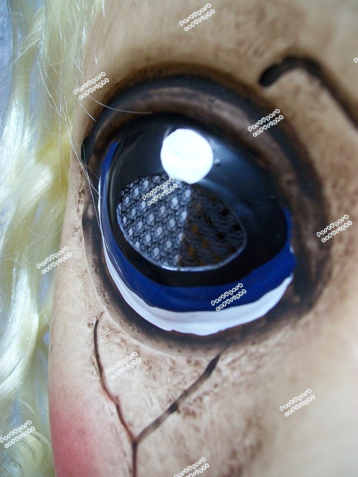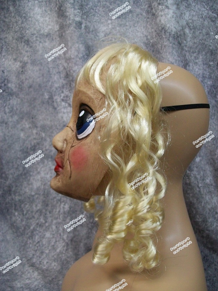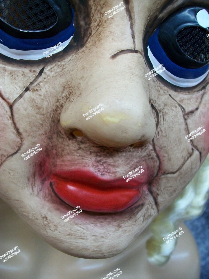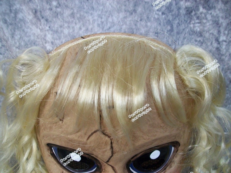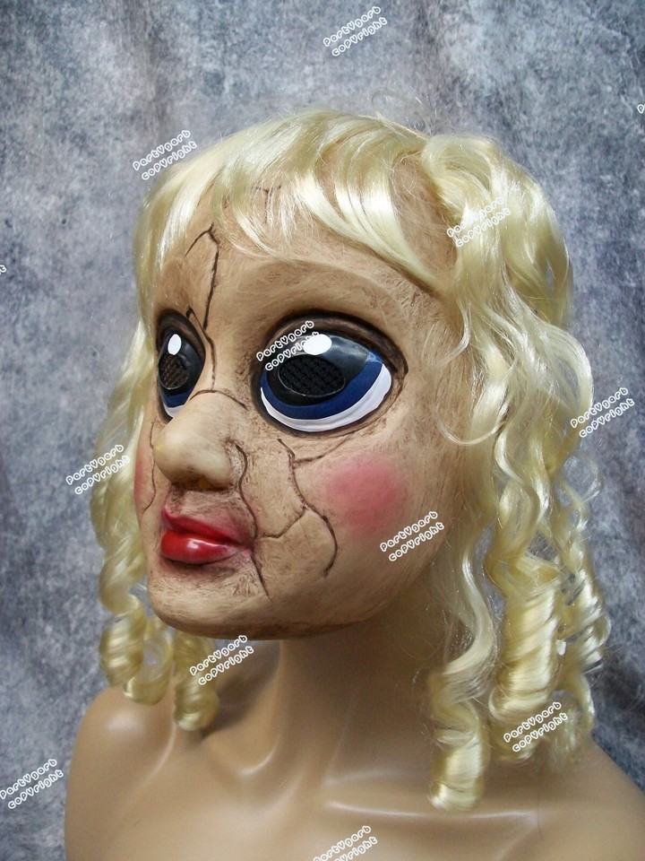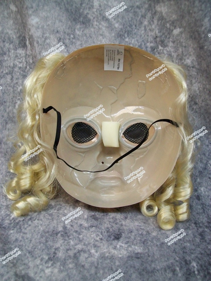 Lightweight Plastic Doll Costume Face Mask. Eerie Baby Doll Face. Face looks dirty and cracked. Some smudges in the paint. Mesh in eye area. Eyes are a bit wider apart so this may be hard to see out of. Has an elastic strap that goes from side to side around back of the head. Has strings of hair sewn onto the mask. Seams are visible where hair is attached. Not a full mask, only covers the front of the face like a shield. Thin Lightweight Molded Plastic (Vacuform). DOES NOT INCLUDE MANNEQUIN.