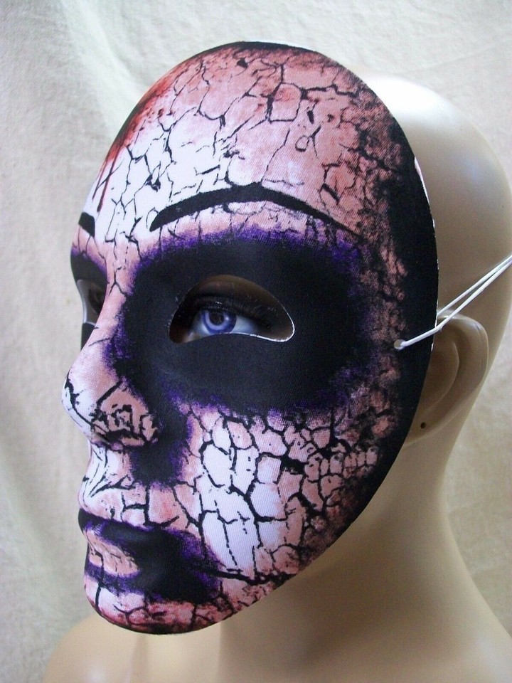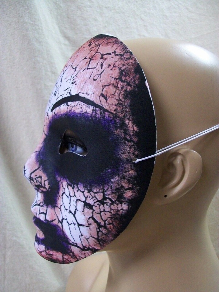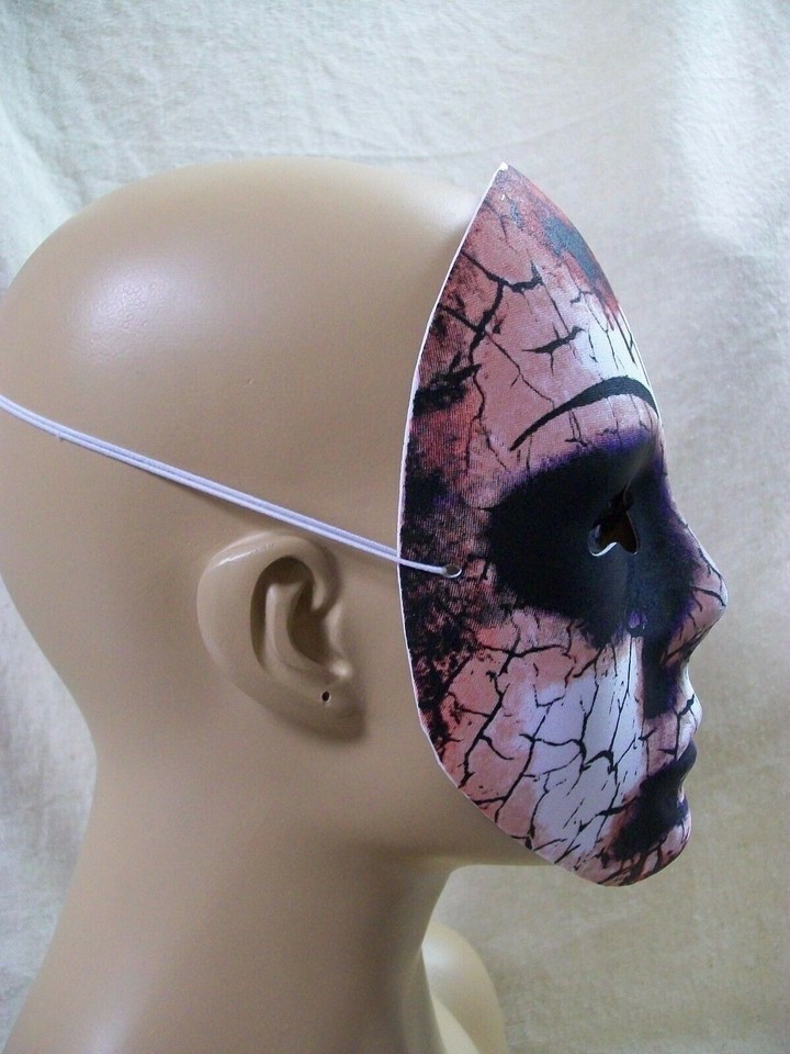 Lightweight Plastic Costume Face Mask. Eerie Bloody Bruised Cracked Face. Has thin elastic straps that goes from side to side around back of the head. Not a full mask, only covers the front of the face like a shield. Looks like it is a Thin Lightweight Molded Plastic (Vacuform) with a printed fabric covered front. No age specs, most costume items are for ages 14 and up. DOES NOT INCLUDE MANNEQUIN.