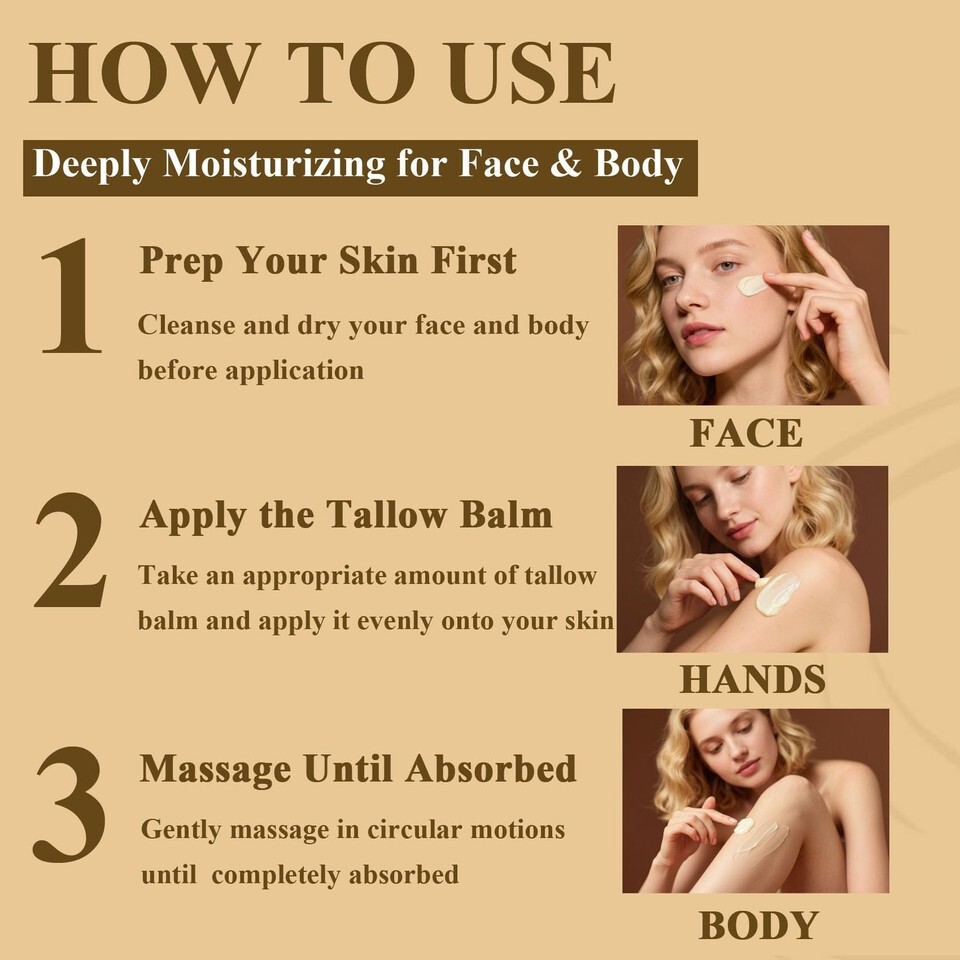 Aplicacion versatil: el sebo de res para la piel se puede aplicar a la cara, manos, piernas, espalda y otras partes; la crema hidratante de sebo de res se absorbe facilmente, no es grasosa, por lo que es adecuada para la gran mayoría de los tipos de piel