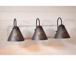 Here is a new classic country lighting fixture designed to illuminate your bathroom, This is called the Crestwood vanity light and it is made of wood and has attached punched tin shades,It has a handpainted and slightly distressed vintage white wooden back with black textured arms and crimped pans,It is Direct wired with three Medium (Standard) sockets, each taking up to 60 watt max. bulbs per arm. (Bulbs not included) it has Black textured arms with crimped pans, and punched kettle black tin shades, And it is Handcrafted in United States, This light is UL-CUL approved also. Below is full Description, this would accent any bathroom or powder room nicely, and also check out my many other nice lighting and Decor.