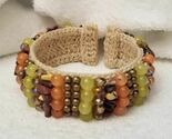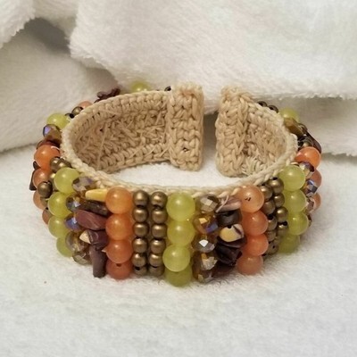 Beautiful crocheted cuff bracelet featuring an eye-catching mix of colorful beads and natural tones. The base is crafted with tightly woven crochet work, creating a sturdy yet flexible band that sits comfortably on the wrist. Layered beads in warm oranges, soft yellows, browns, gold accents, and faceted shimmer beads add rich texture and a vibrant boho feel. This statement cuff is perfect for adding earthy style to casual outfits, festival looks, or unique everyday wear. The open-back cuff design makes it easy to slip on and adjust for comfort. Details: ? Crocheted cuff ? Multicolor beading (rounds, chips, metals faceted beads) ? Comfortable open-back design ? Bohemian, earthy, eclectic style ? Lightweight yet bold ? Fits a 7" wrist. A one-of-a-kind accessory ideal for bracelet collectors and jewelry lovers.