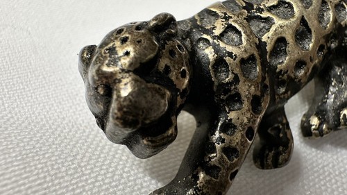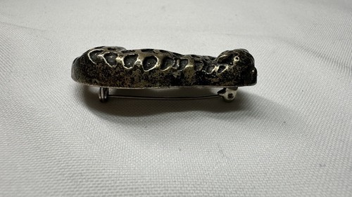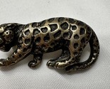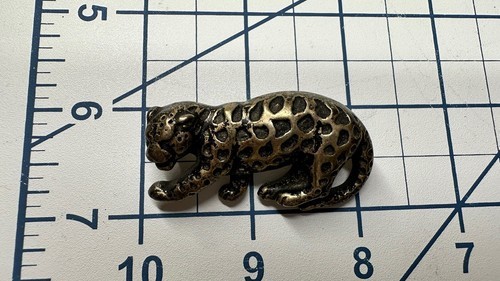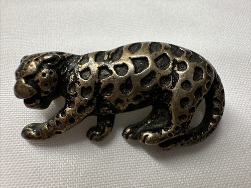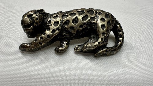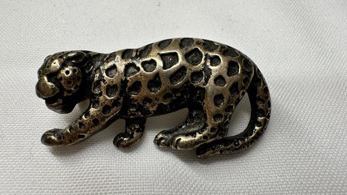 This stunning vintage pin features a beautifully designed crouching leopard. The metal has a unique patina and the pin measures 1.75 inches in length. It is perfect for those who appreciate vintage jewelry and unique animal designs. The pin has no stones and the metal purity, material, and country of origin are unknown. It is a great addition to any vintage jewelry collection or to wear as a statement piece.