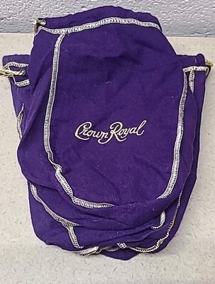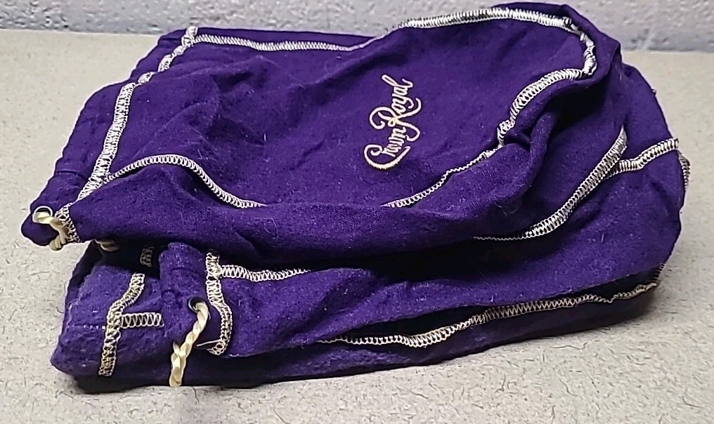 The product is a lot of six 9" Crown Royal purple bags with drawstrings, original advertising items from the distillery. Made in Canada, these bags feature the iconic Crown Royal logo and theme, perfect for collectors of distillery memorabilia. The purple color adds a unique touch to the design, making them a standout piece for any collection. Ideal for fans of Crown Royal and distillery advertising.