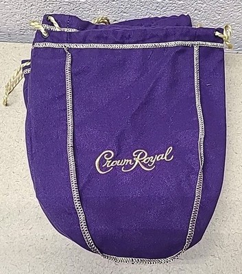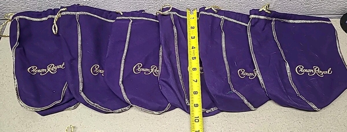 The product is a lot of six 9" Crown Royal purple bags with drawstrings, original advertising items from the distillery. Made in Canada, these bags feature the iconic Crown Royal logo and theme, perfect for collectors of distillery memorabilia. The purple color adds a unique touch to the design, making them a standout piece for any collection. Ideal for fans of Crown Royal and distillery advertising.