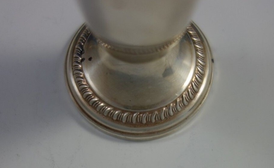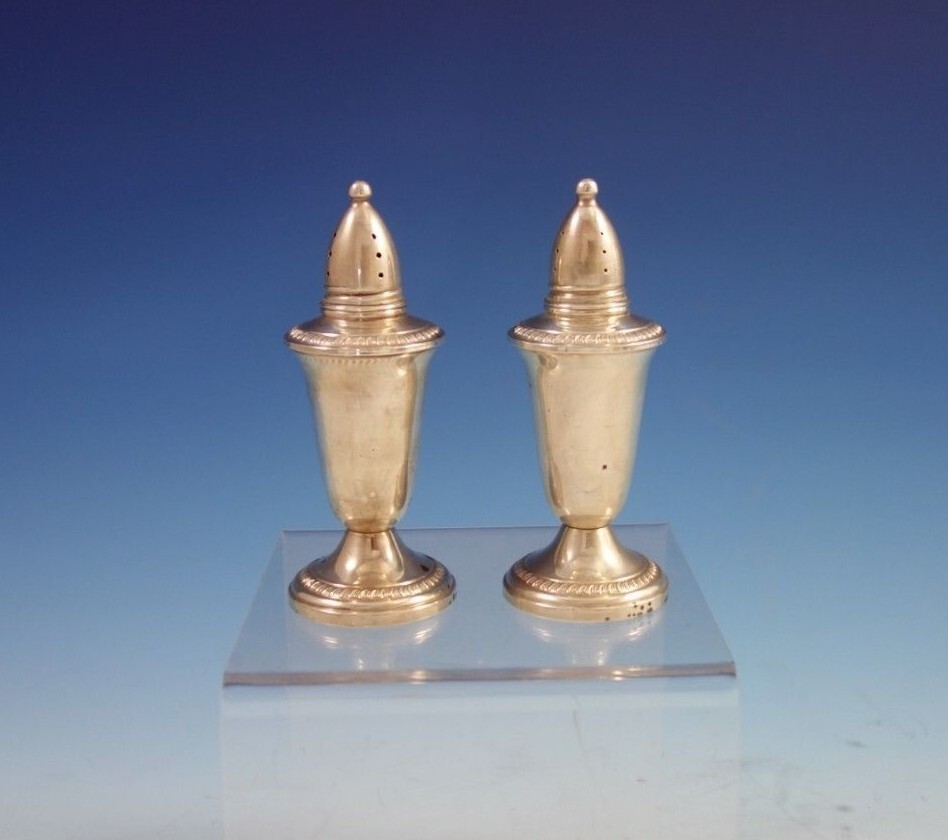 Lovely Crown pattern by unknown maker sterling silver salt and pepper shaker pair with gadroon border. The shakers measure 2 5/8" x 4 5/8" and are weighted. The pieces are not monogrammed and are in good vintage condition. Note: The shakers have some dings, being sold "as is".