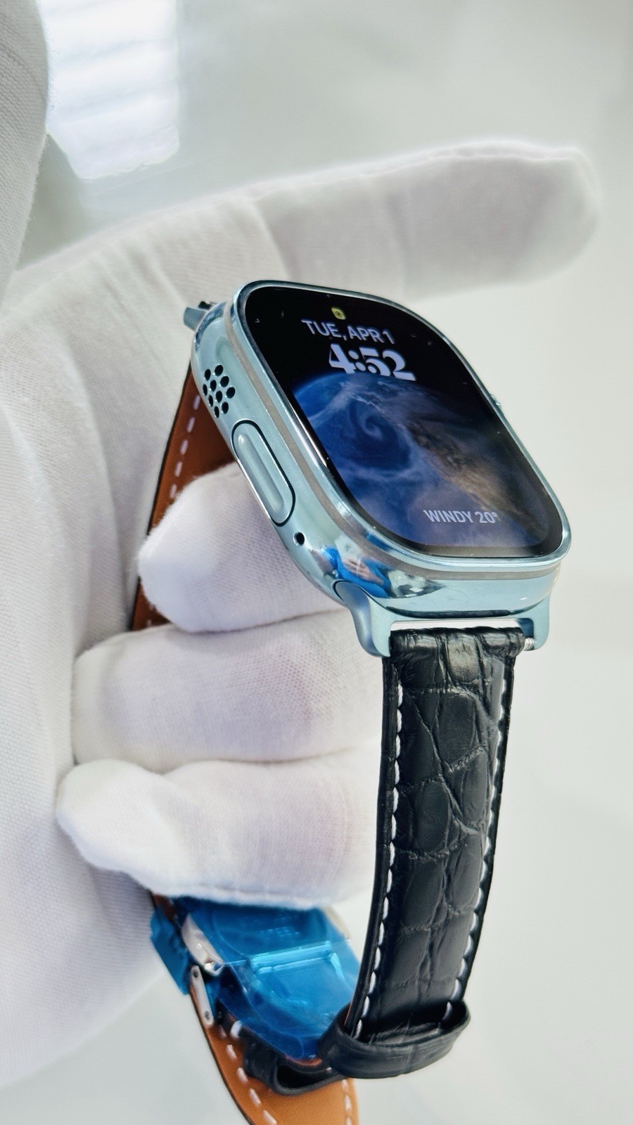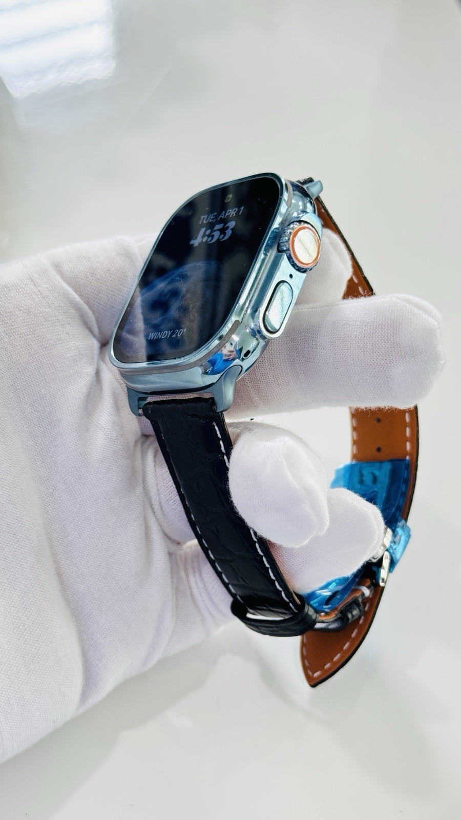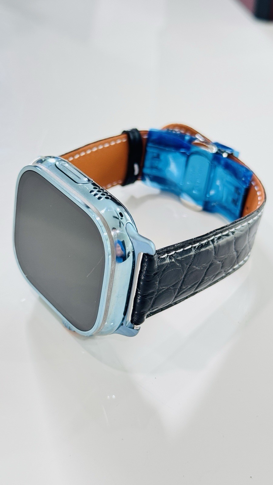 - Custom Apple Watch ULTRA 2 49mm SKY BLUE Polished Anodized Black Leather LTE GPS