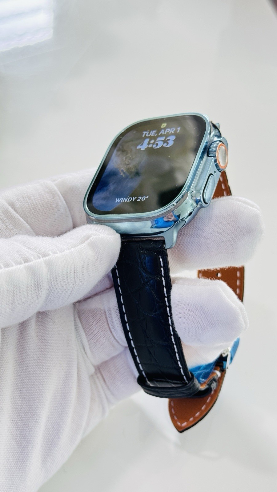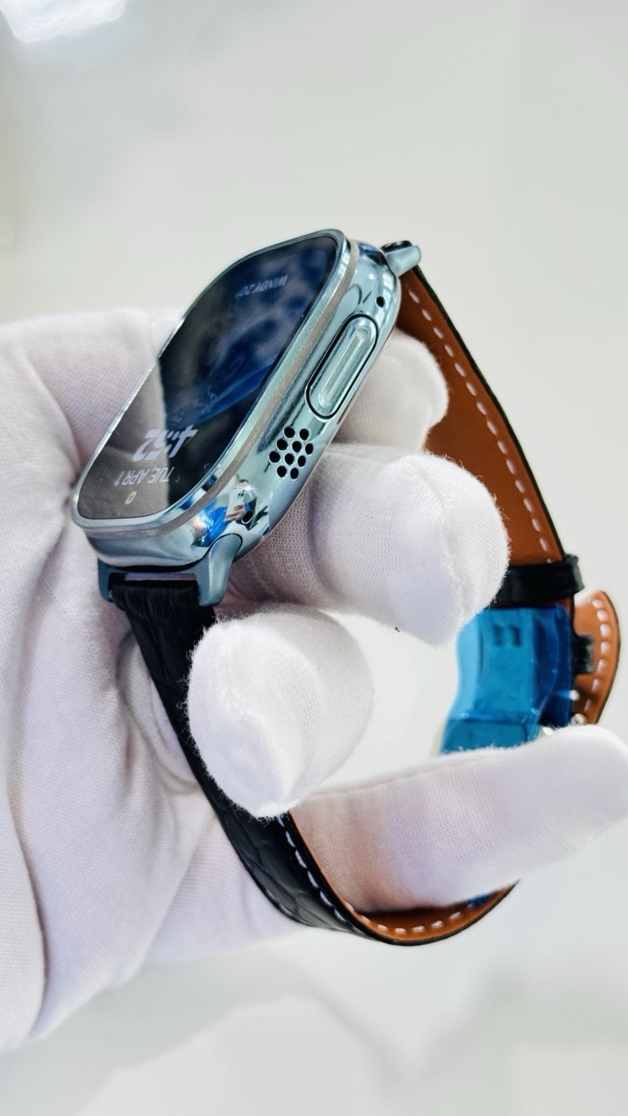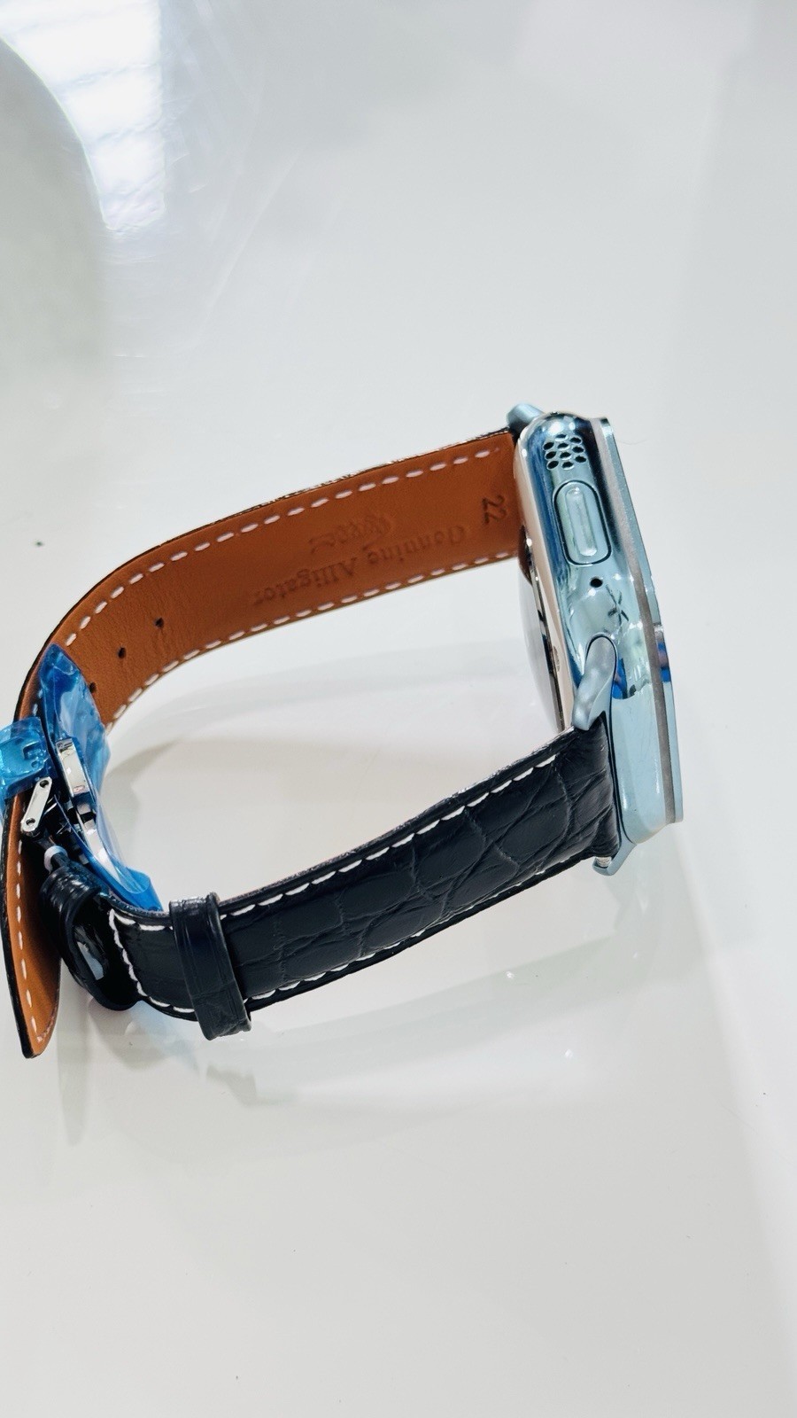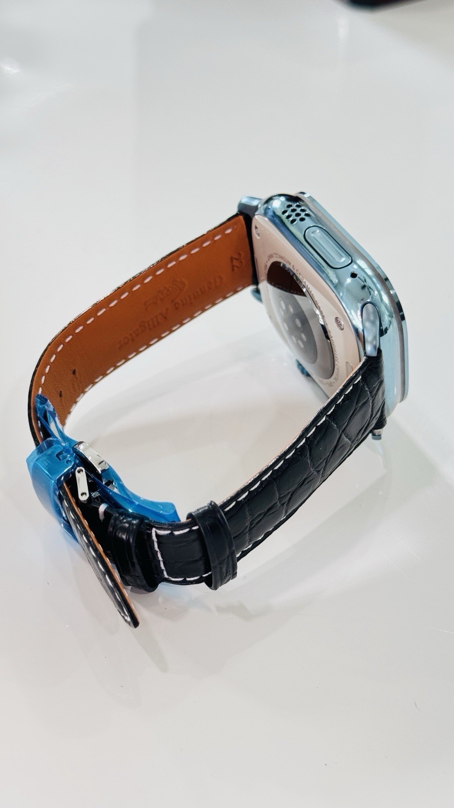 - Custom Apple Watch ULTRA 2 49mm SKY BLUE Polished Anodized Black Leather LTE GPS