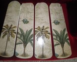 Brand new in the box 42" flushmount ceiling fan with single school house style light fixture attached. Only the blades have been removed to have tropical palm tree and gold script motif graphics applied. Blades are then selaed with a polyacrylic to protect the finish