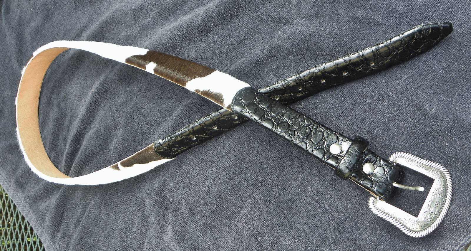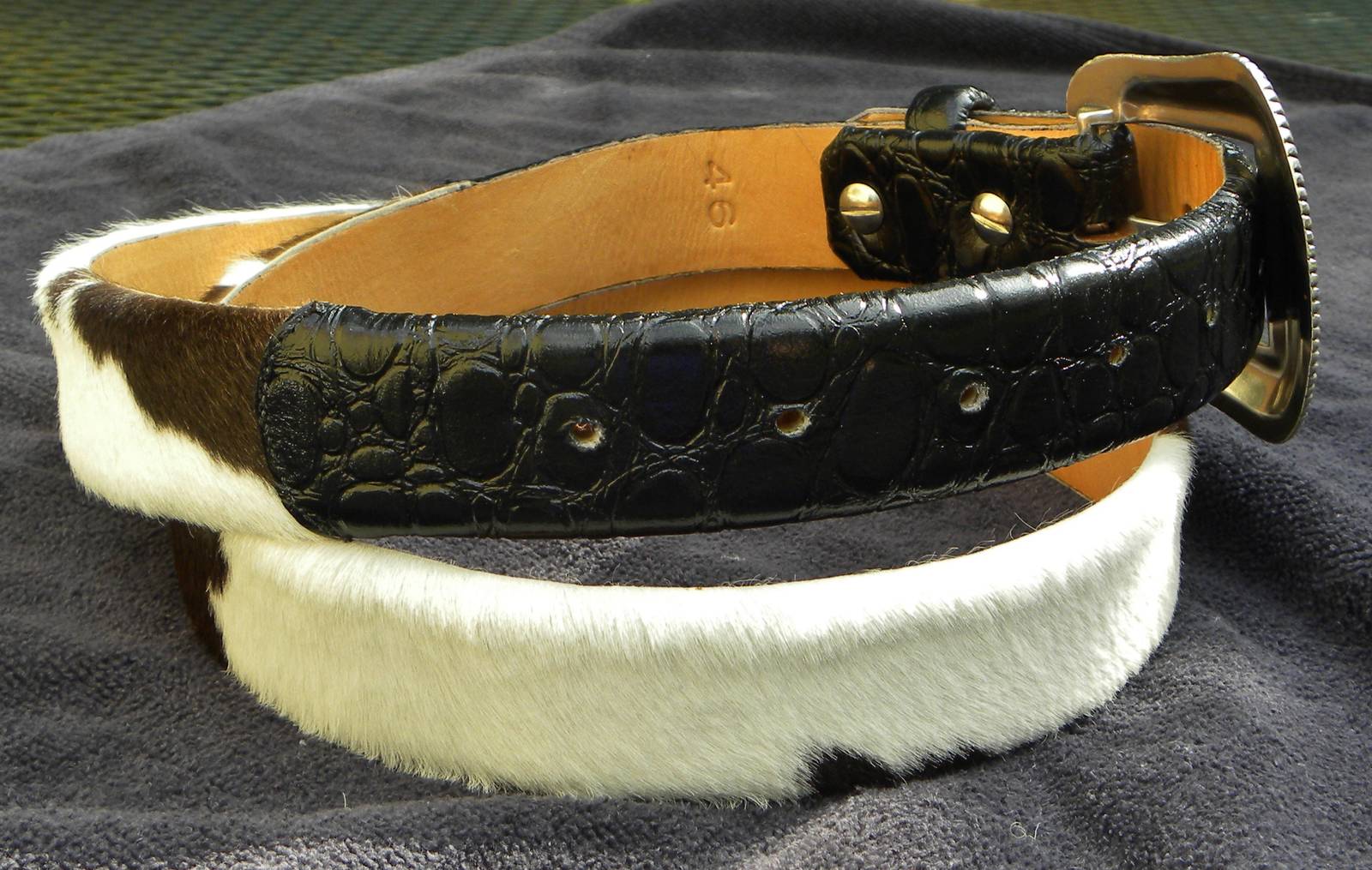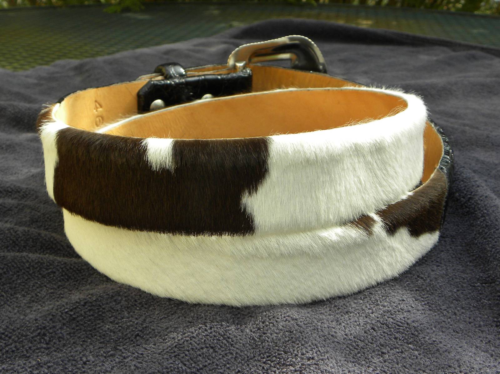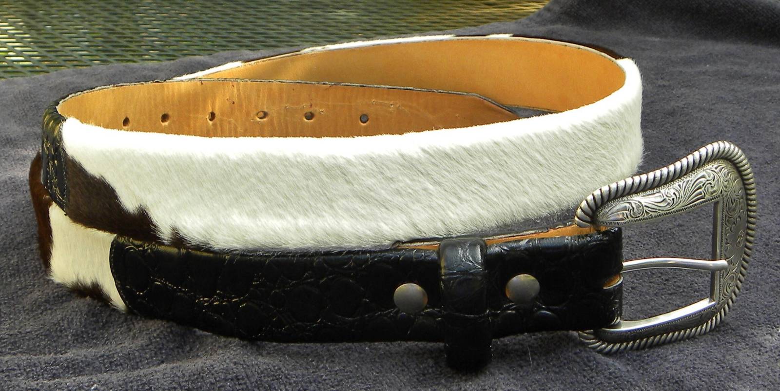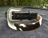 For Sale: preowned Custom Vintage Hard-to-find handmade White very dark brown Cowhide fur and Black Moc Croc /reptile with a Silver etched Buckle. Beautiful Belt... Size 46-length measures 52.25". I rarely get belts this nice in size 46.