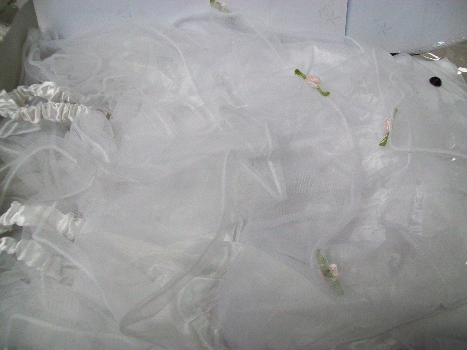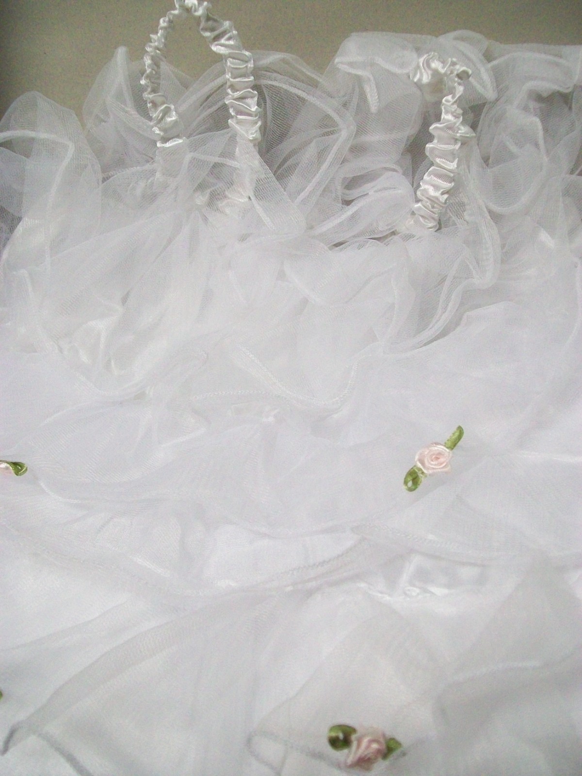flowers on the dress. White Satiny like Dress with spaced Tulle like ruffles
