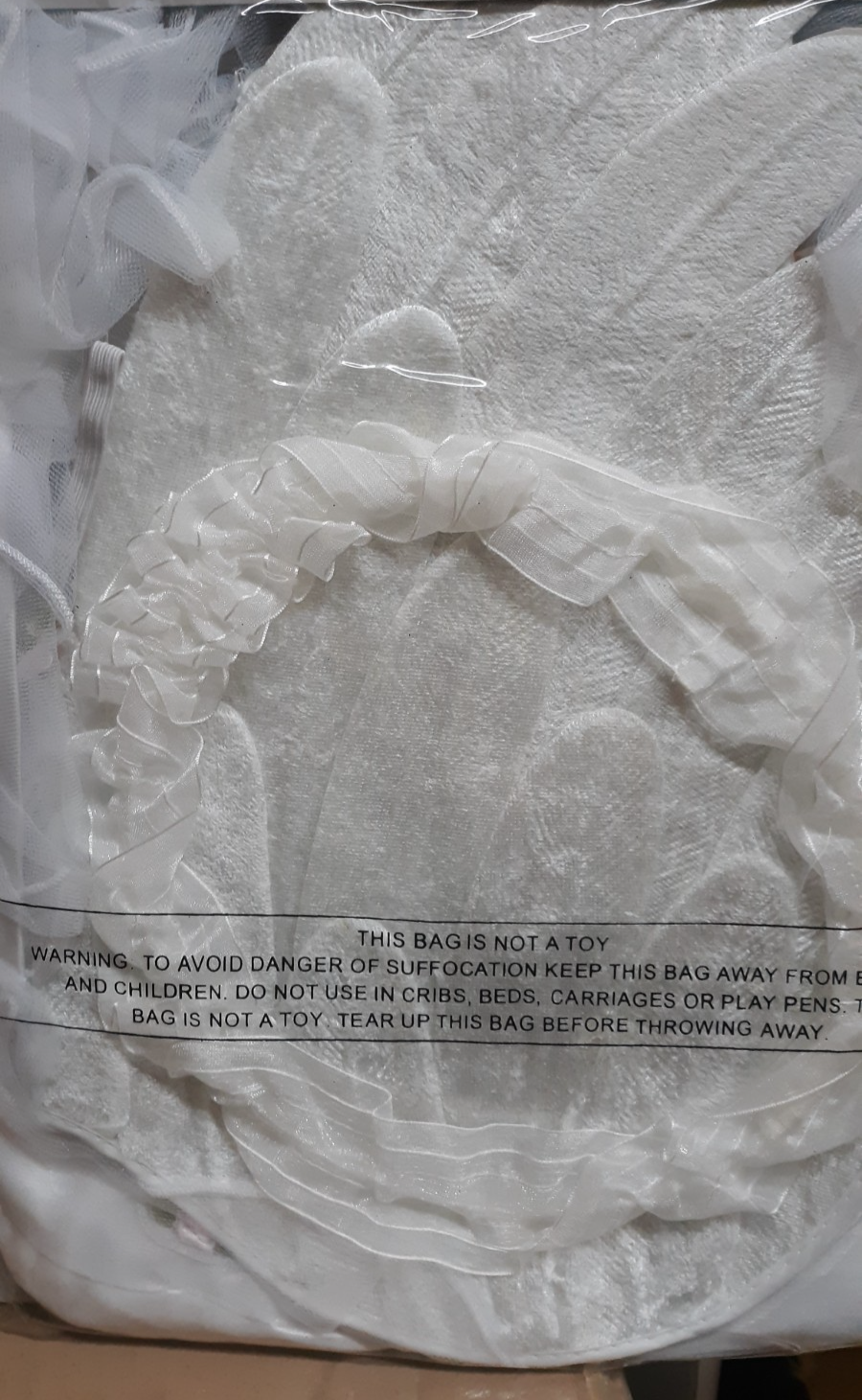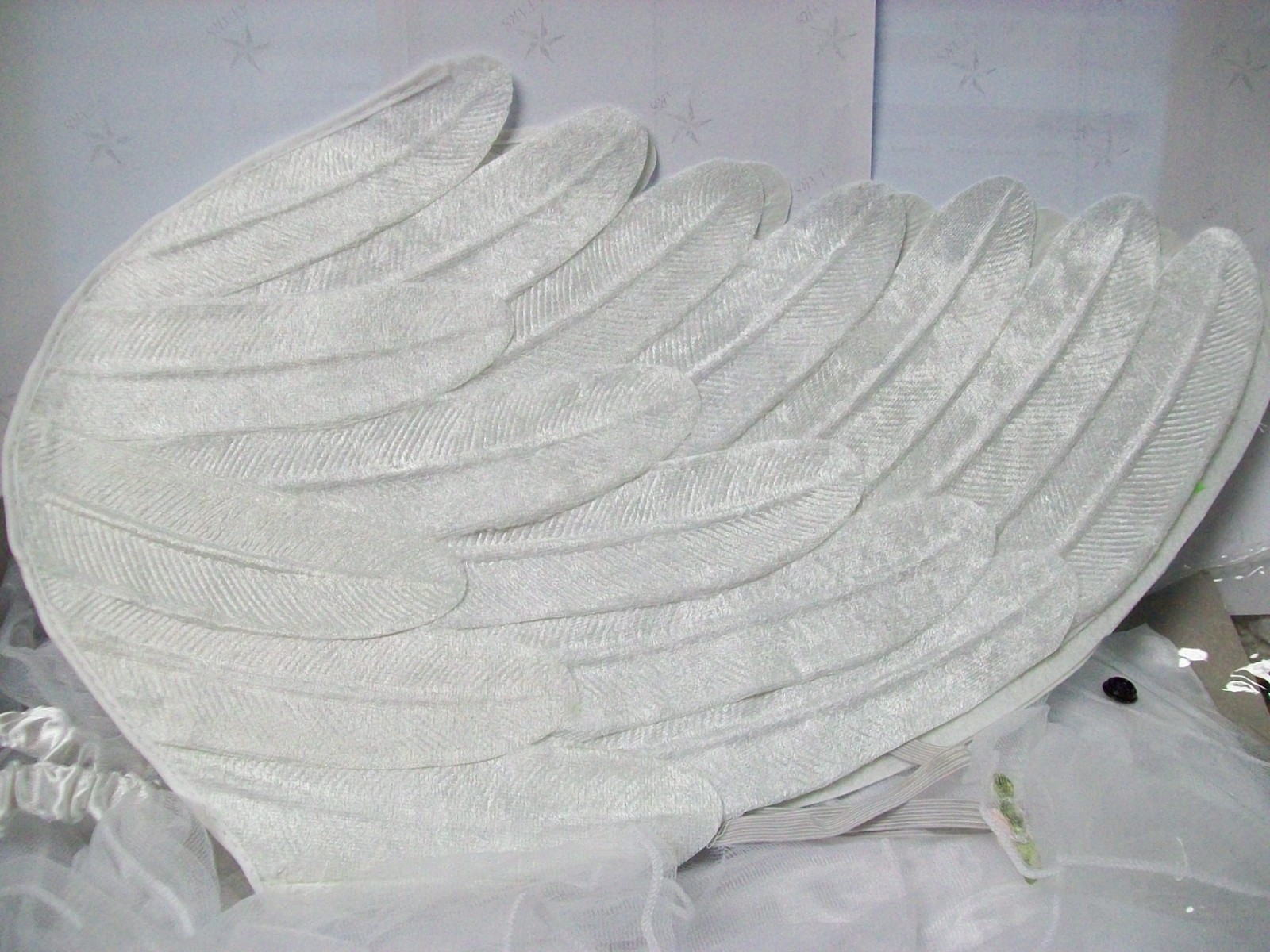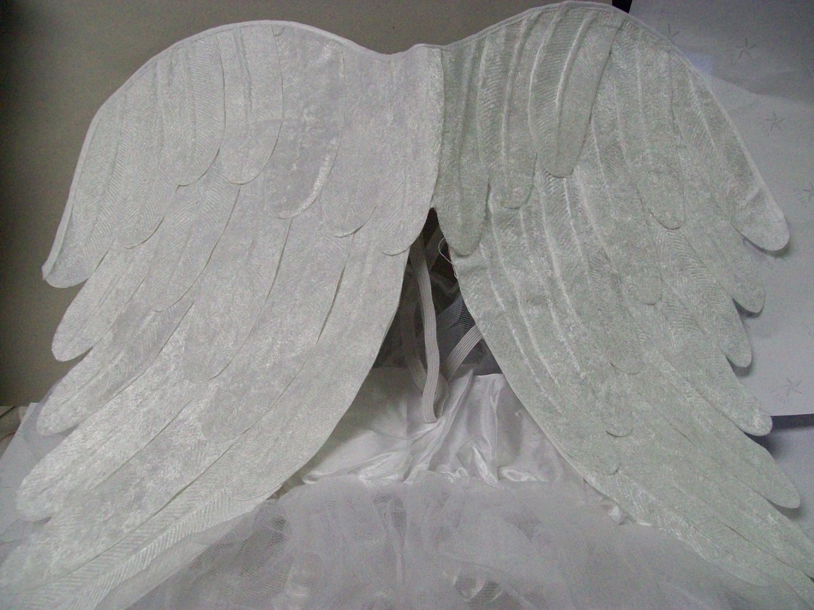 leaves. Wings are a white felt like material that is embossed and overlapped to