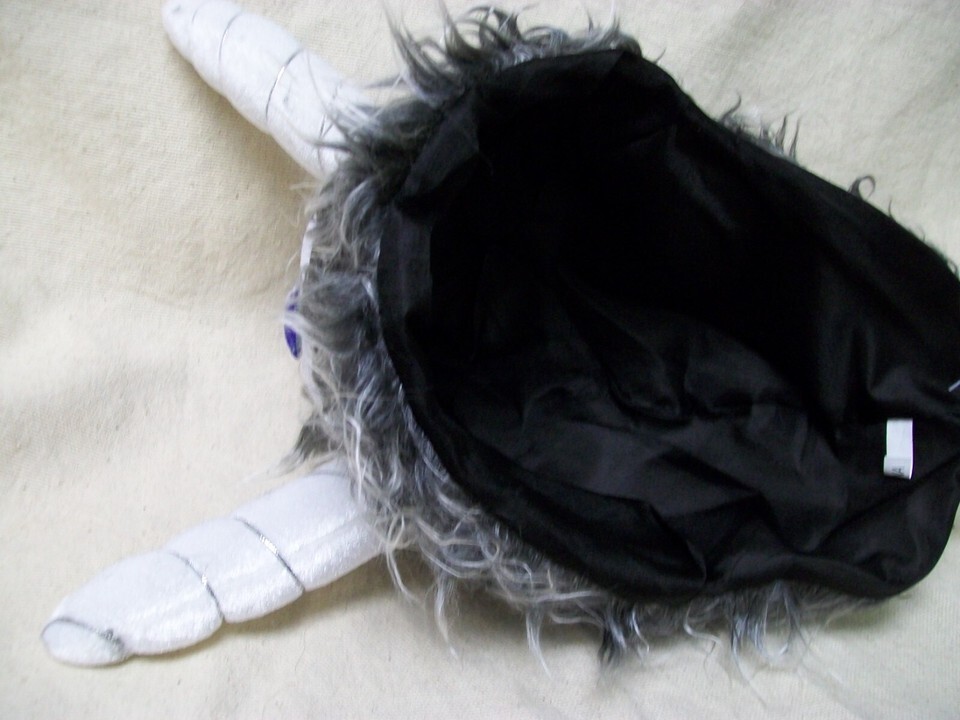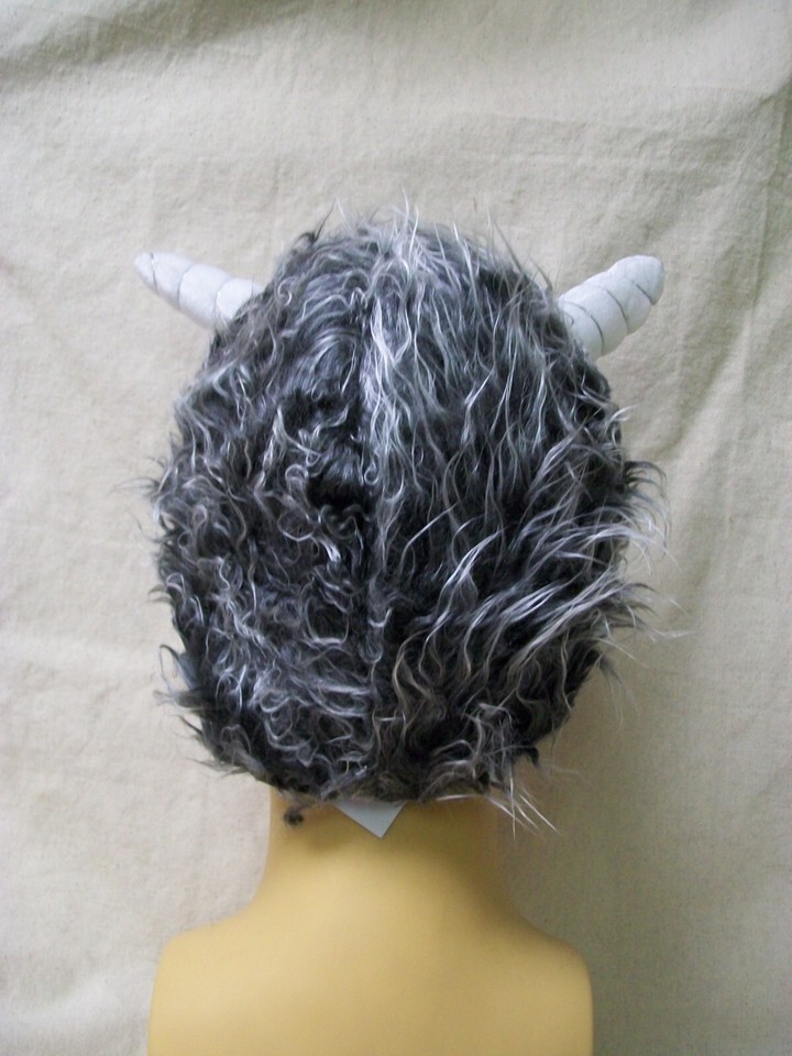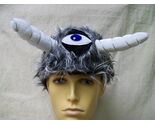 Faux Furry One Eyed Beast costume Hat with Horns. One Size Fits Most. No Ages specs on tag. Has black fabric lining.