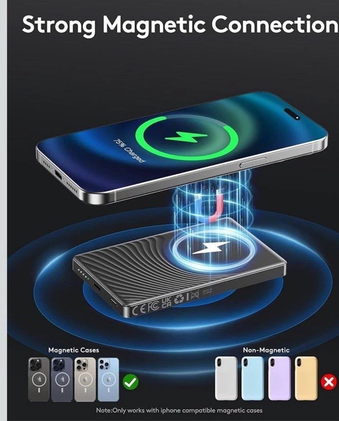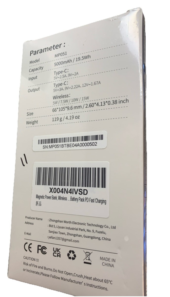 The D Badness MP051 Magnetic 5000mAh Slim Power Bank in Black is a sleek and powerful portable charger designed for convenience and efficiency. With wireless charging capabilities and a slim design, this power bank is perfect for on-the-go use. The included Lithium Polymer batteries provide long-lasting power, while the magnetic mounting feature ensures easy and secure attachment to your device. Manufactured by Zhongshan Worth Electronic Technology Co., Ltd, this power bank is a reliable and stylish accessory for your mobile devices.
