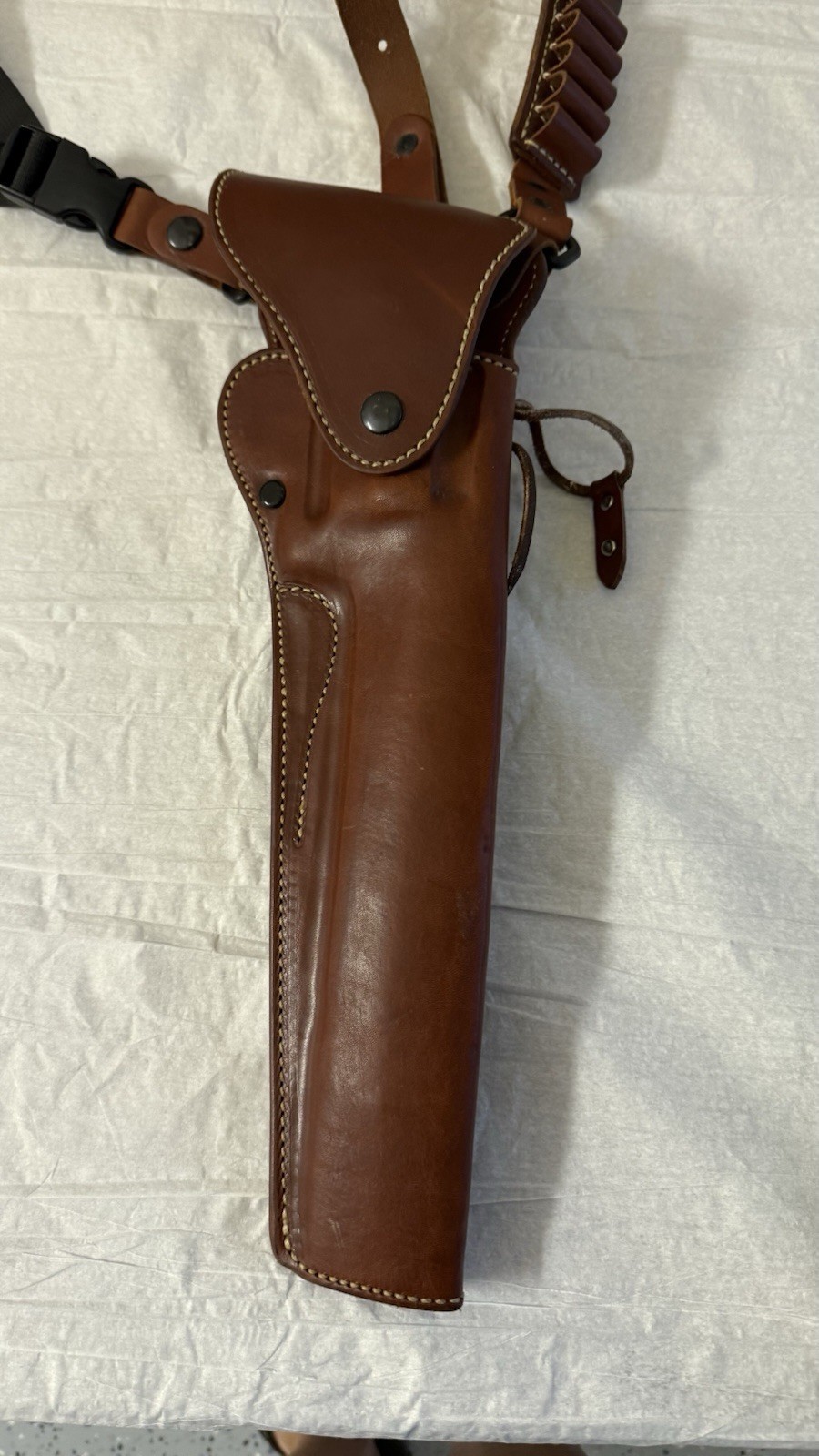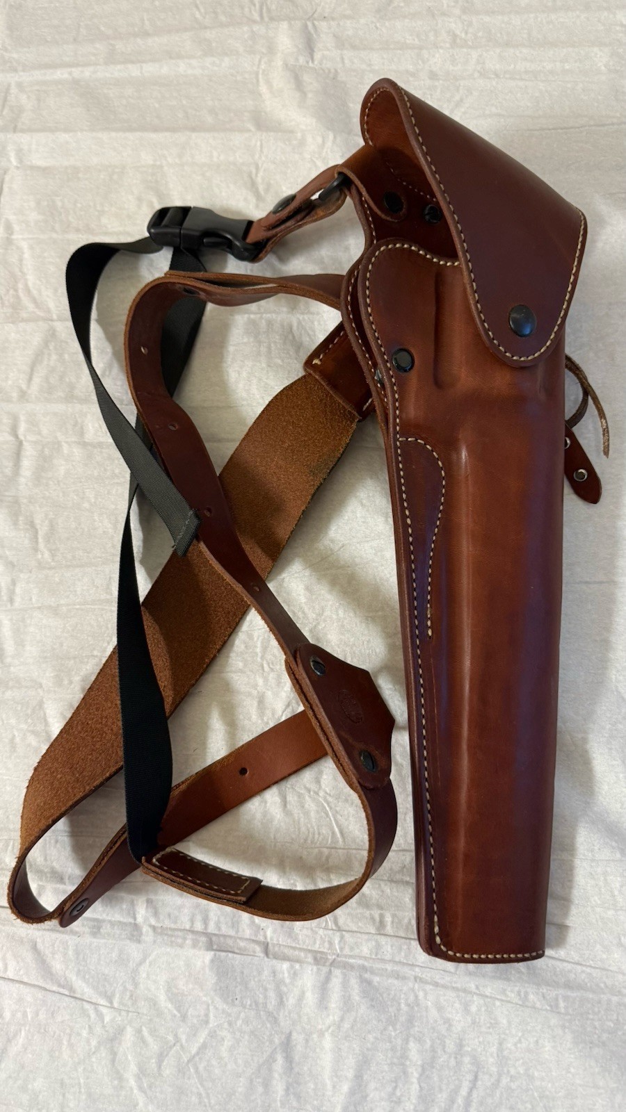 The D. Johnston Alaska Leather Holster is a high-quality, durable rig designed for right-handed shooters. Made in Alaska by the reputable brand D. Johnston Maker, this holster is crafted from brown leather, providing a secure and comfortable fit for your handgun. With adjustable straps and an ammo slide feature, this shoulder carry rig is ideal for hunting and shooting sports, offering both functionality and style for the avid outdoorsman.