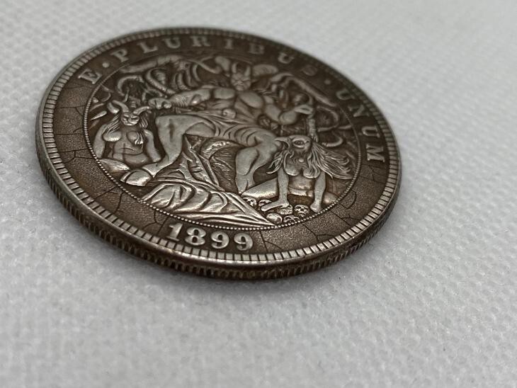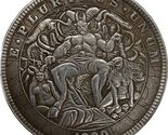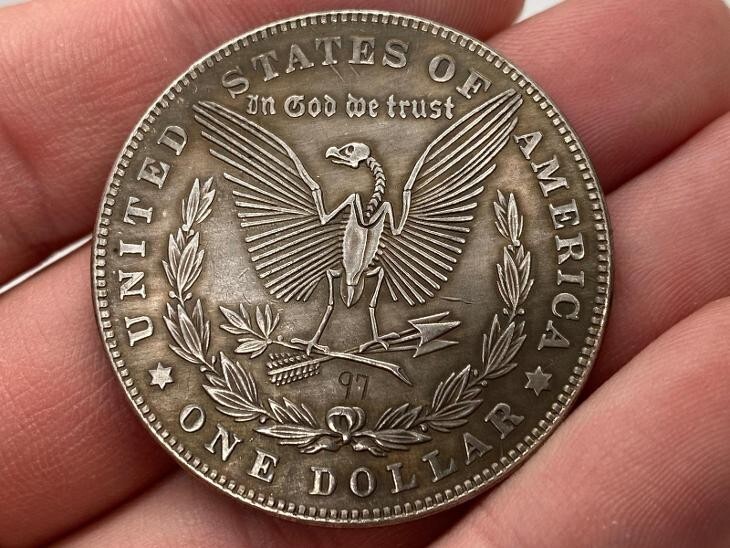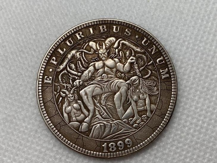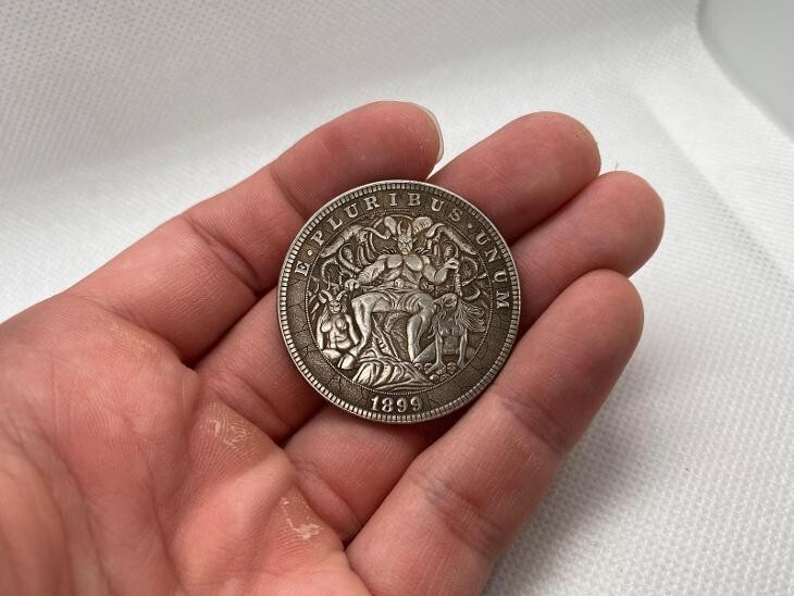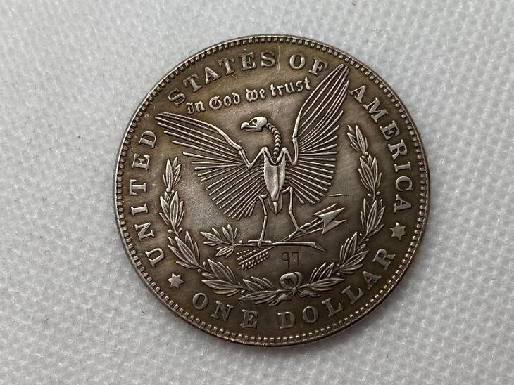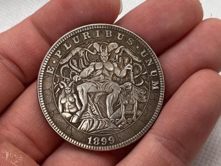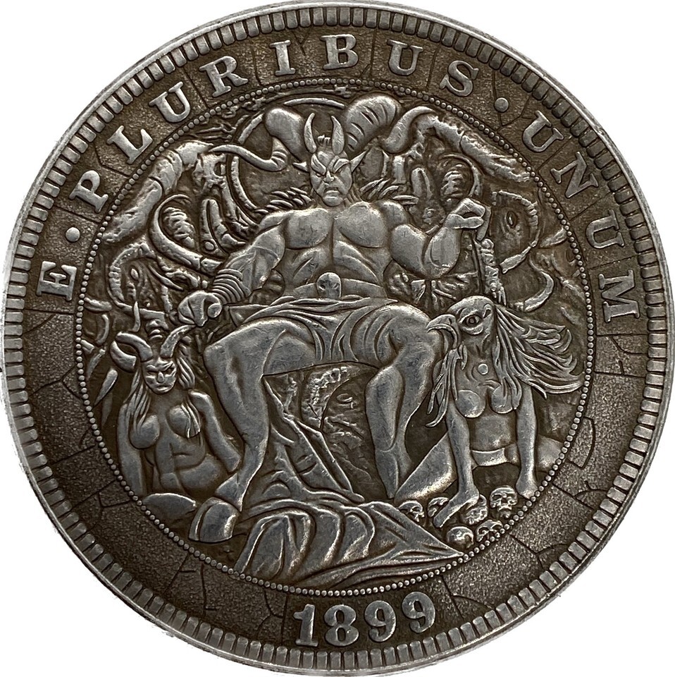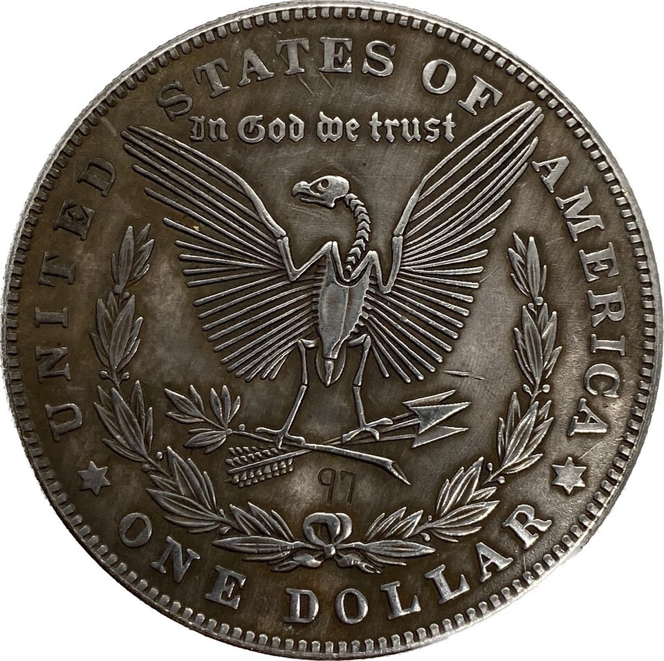Entdecken Sie den fesselnden Reiz der Fantasy-Münzreplik mit damonischem Thema von 1899, einem markanten Stück moderner numismatischer Kunst, das dunkle und okkulte Themen mit dem traditionellen Münzformat verbindet. Diese bemerkenswerte Replik verfügt über eine detaillierte Vorderseite, die eine damonische Gottheit oder einen Satyr in einer befehlenden Pose zeigt, umgeben von verschiedenen allegorischen Figuren. Dieses Design stellt die konventionellen historischen oder nationalen Symbole in Frage, die typischerweise auf Münzen dargestellt sind, und enthalt den Ausdruck "E Pluribus Unum" und das Jahr 1899, das an den klassischen amerikanischen Dollar erinnert, wahrend es durch eine kühne und symbolisch reiche sthetik verwandelt wird. Auf der Rückseite zeigt die Münze einen Skelettadler, ein traditionelles Emblem der USA, das in grotesker Form prasentiert wird. Diese eindringliche Bildsprache dient als kraftvolle künstlerische Aussage und symbolisiert Tod und Zerstorung sogar im Kontext gewohnlich patriotischer Symbole. Das einzigartige Design dieser Münze verleiht ihr einen modernen, fast dystopischen Charakter und macht sie zu einer perfekten Erganzung für Sammler auf der Suche nach etwas Unkonventionellem. Diese Replik bleibt ein unverwechselbares Artefakt, das sowohl eine historische sthetik als auch einen zeitgenossischen kreativen Ansatz verkorpert, perfekt für Enthusiasten und Sammler gleichermaßen.
