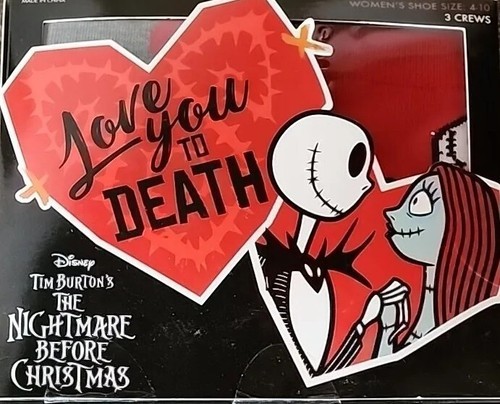This Sale is for One (1) Disney Crew Sock Set Tim Burton's ~ The Nightmare Before Christmas Three (3) Pair Crew Socks Women's Shoe Size 4-10 "Love You To Death" Socks are new in the original packaging Please view photos for a good description of this item Thank you!
