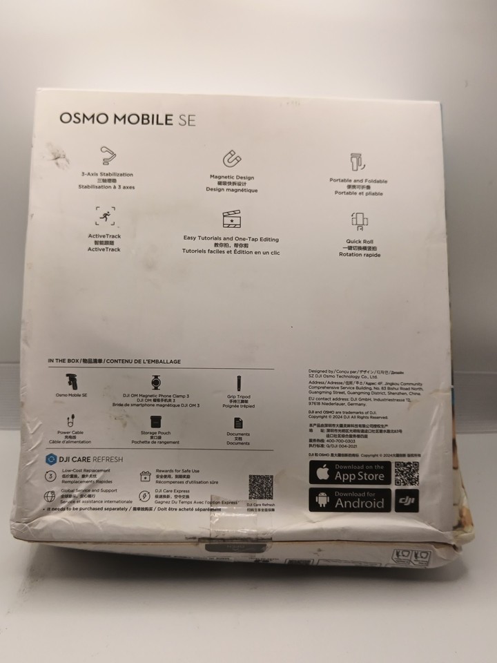 The DJI Osmo Mobile SE is a smartphone camera mount with a 3-axis gimbal that provides stable and smooth footage. With a magnetic design and foldable tripod, it offers convenience and versatility for on-the-go videography. The quick roll feature and active track 5.0 enhance the user experience, making it a reliable tool for capturing professional-looking shots with ease. The portable nature of the device also makes it easy to transport and use in various shooting locations. Made by DJI, a reputable brand in the industry, this gimbal stabilizer is a valuable addition to any vlogger or photographer's gear collection. Box has wear