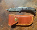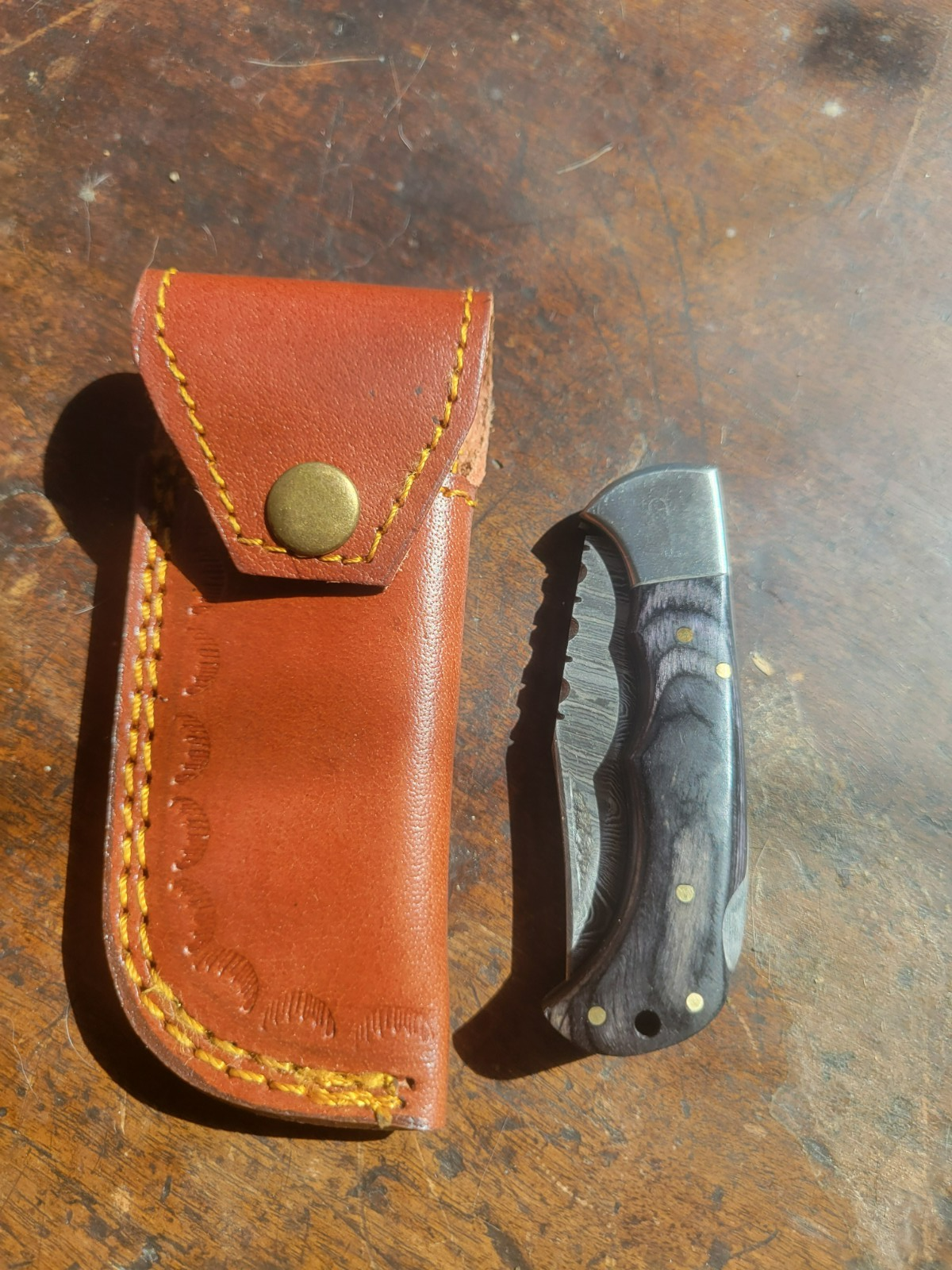 - Damascus Steel Pocket Folding Knife 6 Inch Dark Wood Handle w/ Sheath