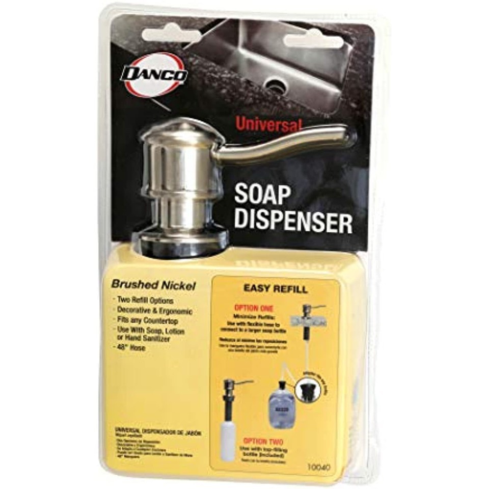 Product Description This Danco Brushed Nickel Soap Dispenser with curved nozzle provides an elegant touch for a bathroom or kitchen installation. Add convenience to your kitchen with this dispenser as it comes with a 48 in. hose that will fit a 1-gallon soap or 12 oz. lotion bottle discreetly hidden underneath the sink to minimize refills. This dispenser can also be filled from the top if used with the included under counter plastic soap container. The longer shank fits most counter tops, including granite and marble. From the Manufacturer Danco is one of the largest plumbing repair, replacement and remodel suppliers in the home improvement industry. We are largely focused on empowering Do It Yourself consumers with affordable plumbing products and solutions which create new and refreshing decors for bathrooms and kitchens.