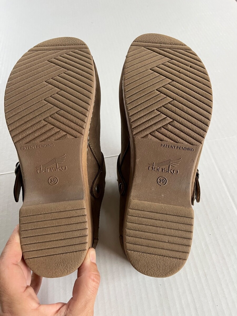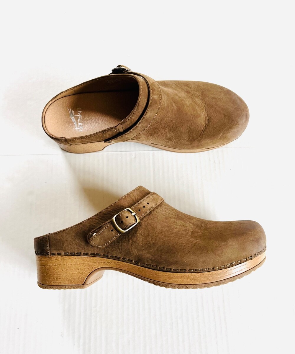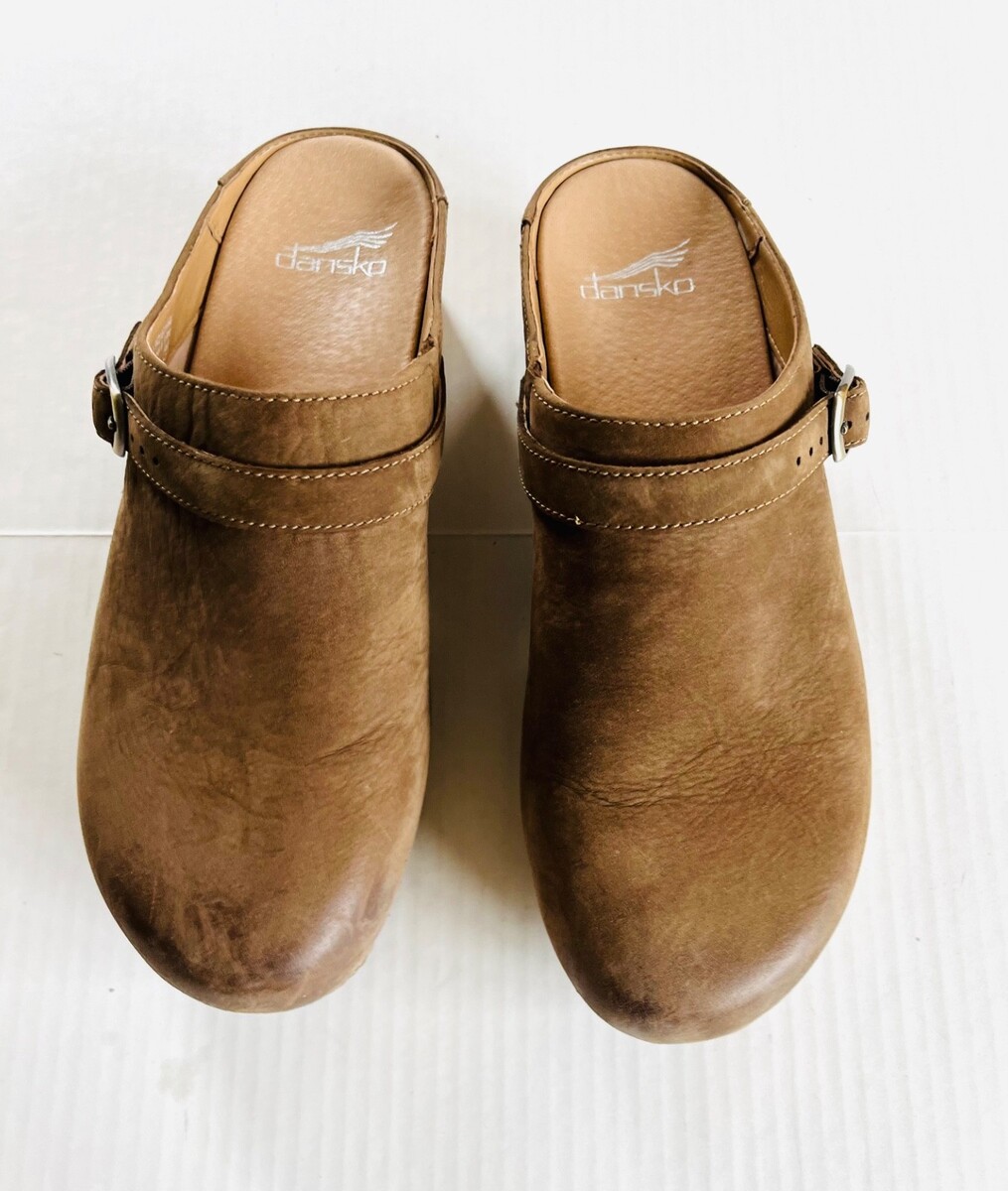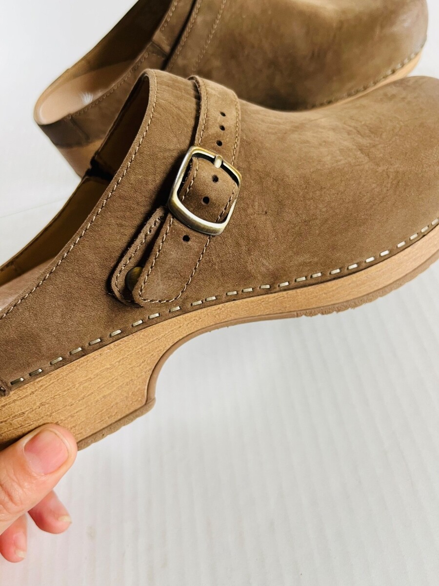 - Dansko Sz 9 Berry Nubuck Tan Leather Suede Buckle Hardware Strap Clogs