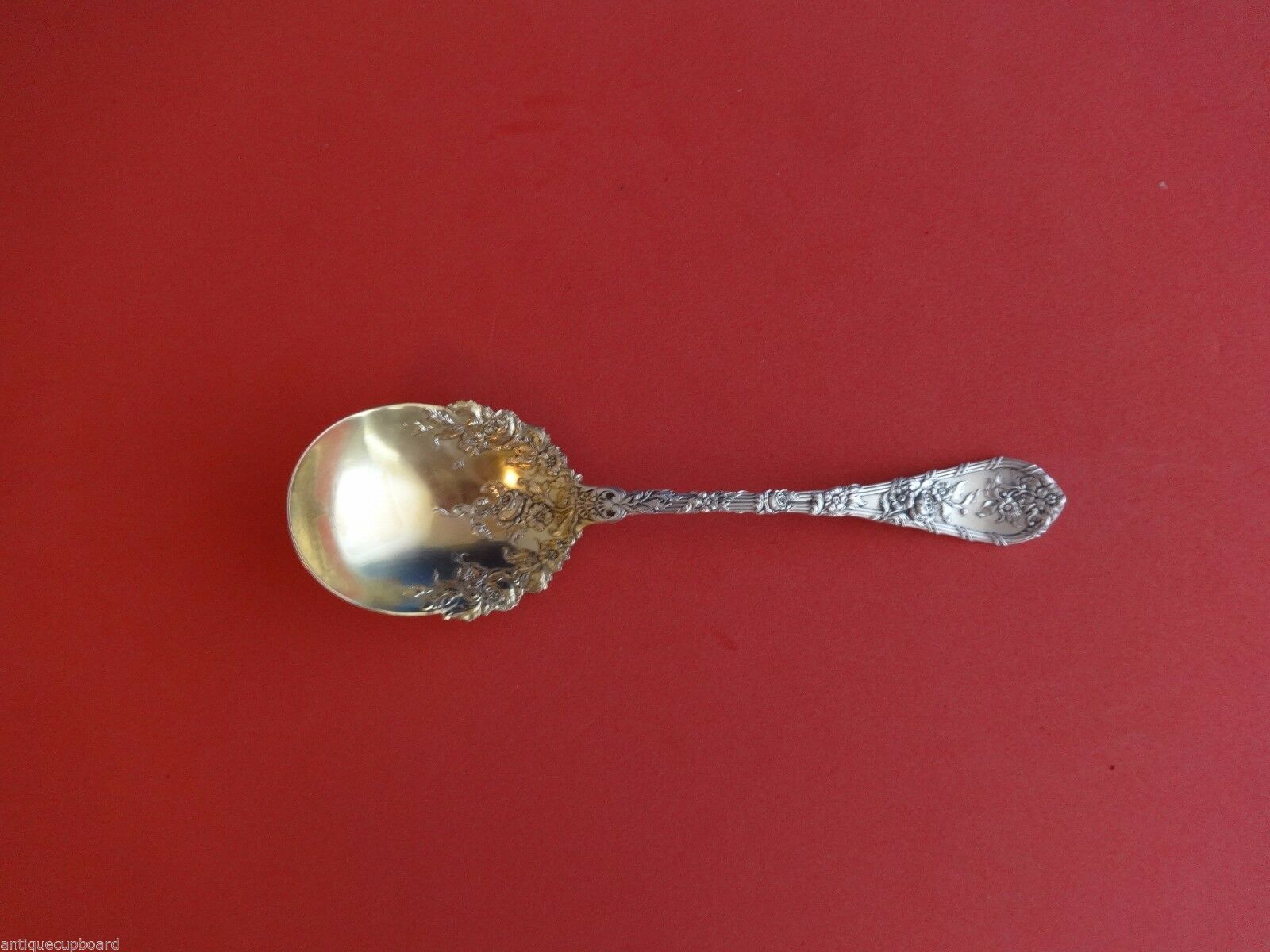 Sterling Silver PRESERVE SPOON GOLD WASHED WITH FANCY FLOWERS IN BOWL 7 1/4" in the pattern DAUPHIN BY DURGIN-GORHAM. It is monogrammed (monos vary) and is in excellent condition.