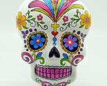 Created in the image of the Calavera skulls created in celebration of the Mexican Day of the Dead, this skull-shaped wall plaque is a colorful display of vivid patterns, ornamenting the skull with patterns of colors, flowers, and crosses in imitation of the sugar skulls placed upon altars during the holiday. A great way to honor loved ones or create a shrine for your ancestors.