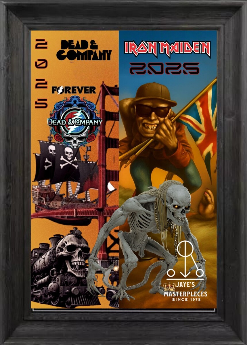 The product is a reproduction 20x30 frame print featuring a combination of Dead and Co. and Iron Maiden, created by artist Jaye Metcalfe. This music memorabilia piece showcases the fusion of two iconic rock and pop bands, making it a unique and eye-catching addition to any music enthusiast's collection. The artwork was created in the United States, adding a special touch to this piece of entertainment memorabilia.