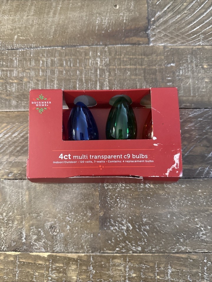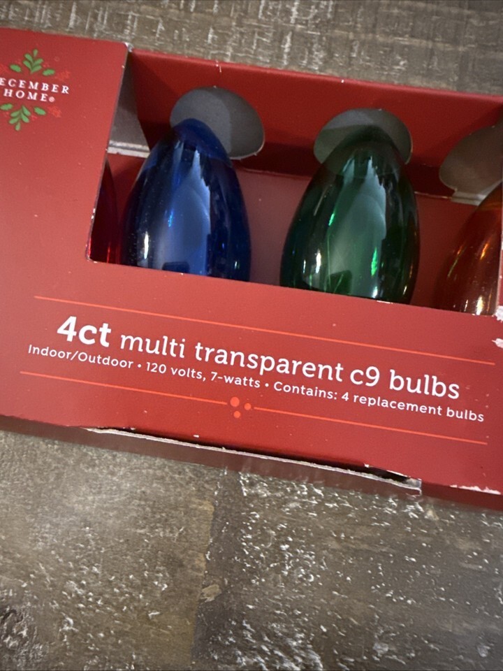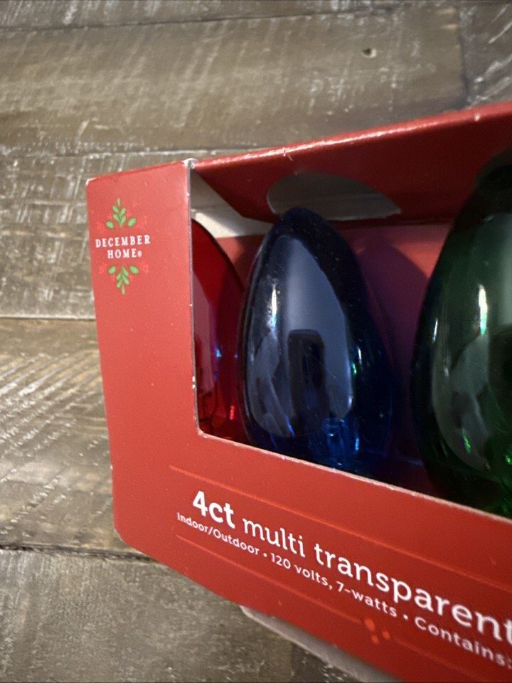 The December Home Multi Transparent Christmas Bulbs are a set of replacement lights designed specifically for Christmas decor. Made by the brand December Home, these bulbs feature a transparent design that allows for a festive and sparkling light display. Perfect for adding a touch of holiday cheer to your home during the Christmas season.