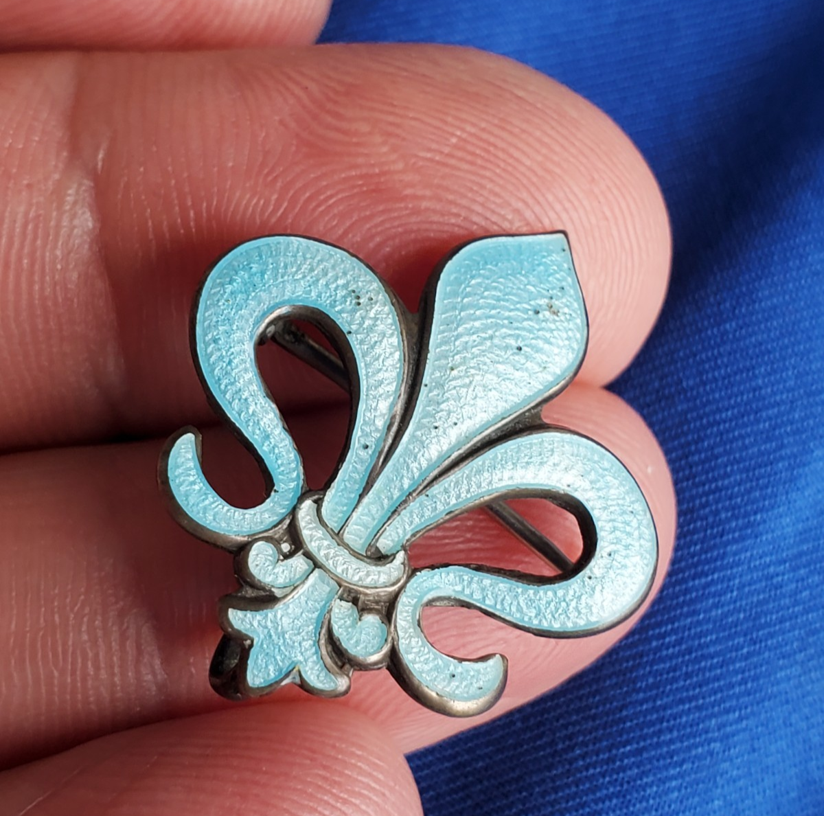 - Deco Guilloche Enamel Brooch Sterling Silver Vintage Hand made Pin Fleur de lis