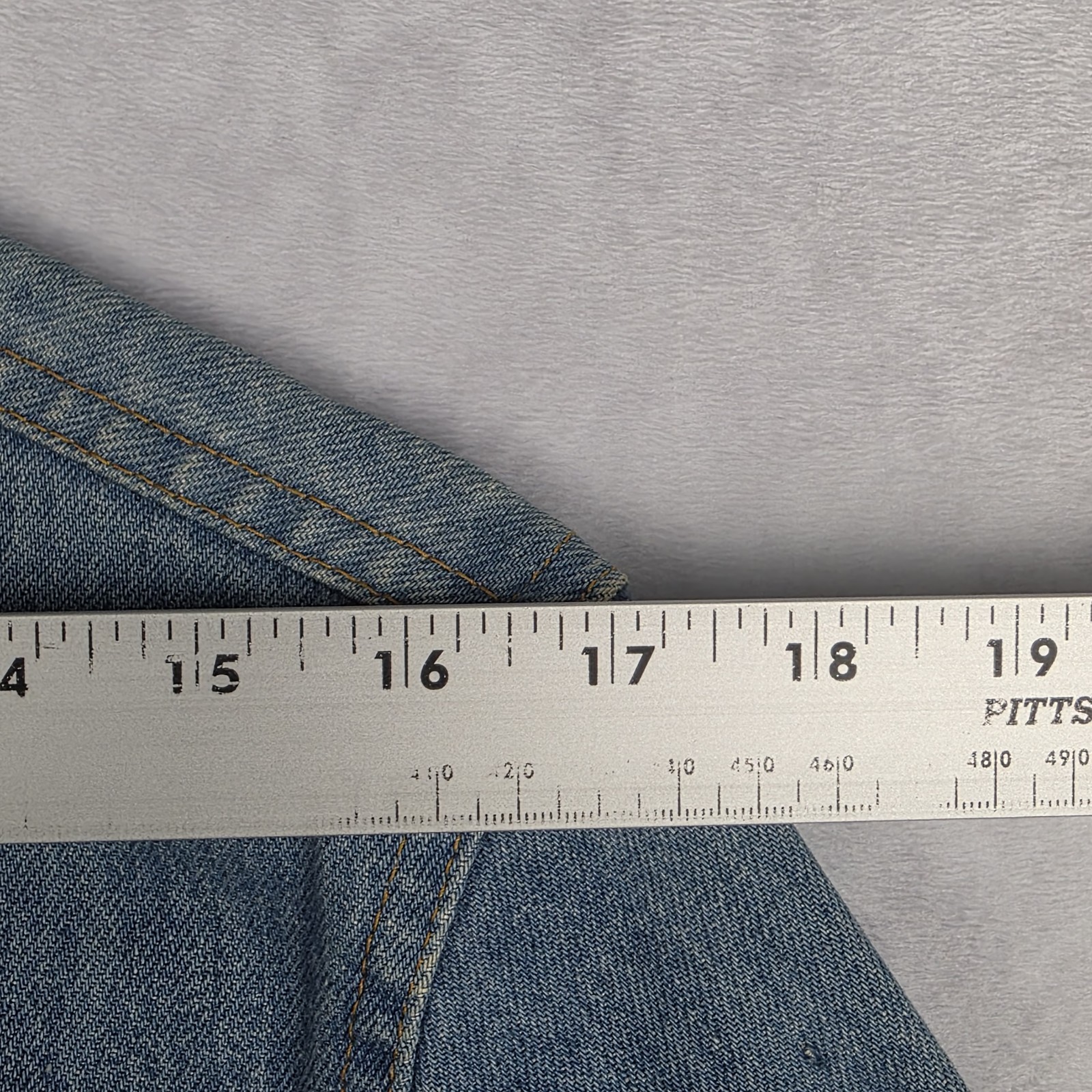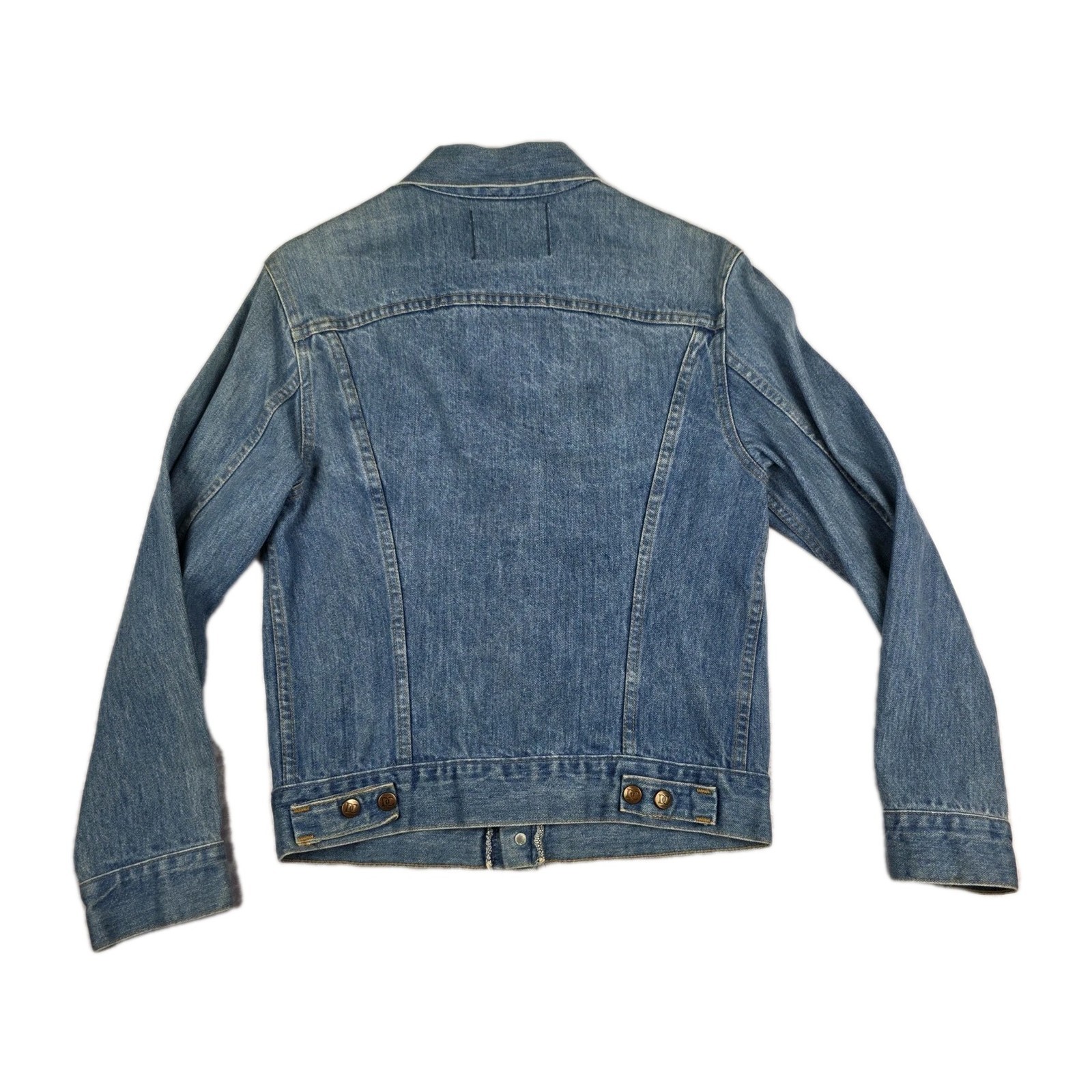 The Dee Cee Western Wear Jacket in size 36 is a vintage piece from the 70s or 80s, featuring a classic blue denim construction with sawtooth pockets. Made of cotton denim, this solid blue jacket has a snap closure and a regular fit, perfect for winter, fall, or spring. The 80s theme adds a unique touch to this timeless piece, ideal for men looking to add a retro touch to their wardrobe. Made in the United States by the DEE CEE brand, this jacket is a versatile and stylish option for any casual outfit.