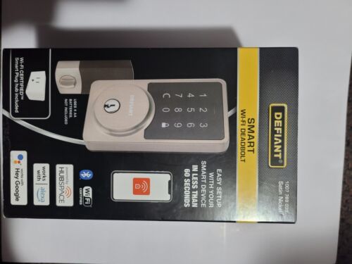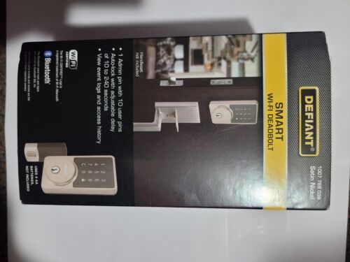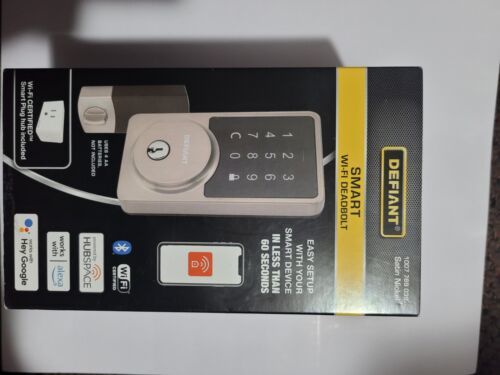 You are Buying a Brand New And Factory Sealed Defiant Square Satin Nickel Smart Hub space Wi-Fi Deadbolt...Wi-fi Electronic Deadbolt. This deadbolt can be unlocked several ways. Remotely (with the Hub space App when utilizing the included smart indoor plug), Bluetooth (with the Hub space App), Digital keypad or a traditional key (2 keys included). Installation is easy with no hardwiring required and only requires a Phillips screwdriver for existing cutouts (Pre-drilled). This unit is ideal for entry doors between 1-3/8 in. - 1-3/4 in. thick.