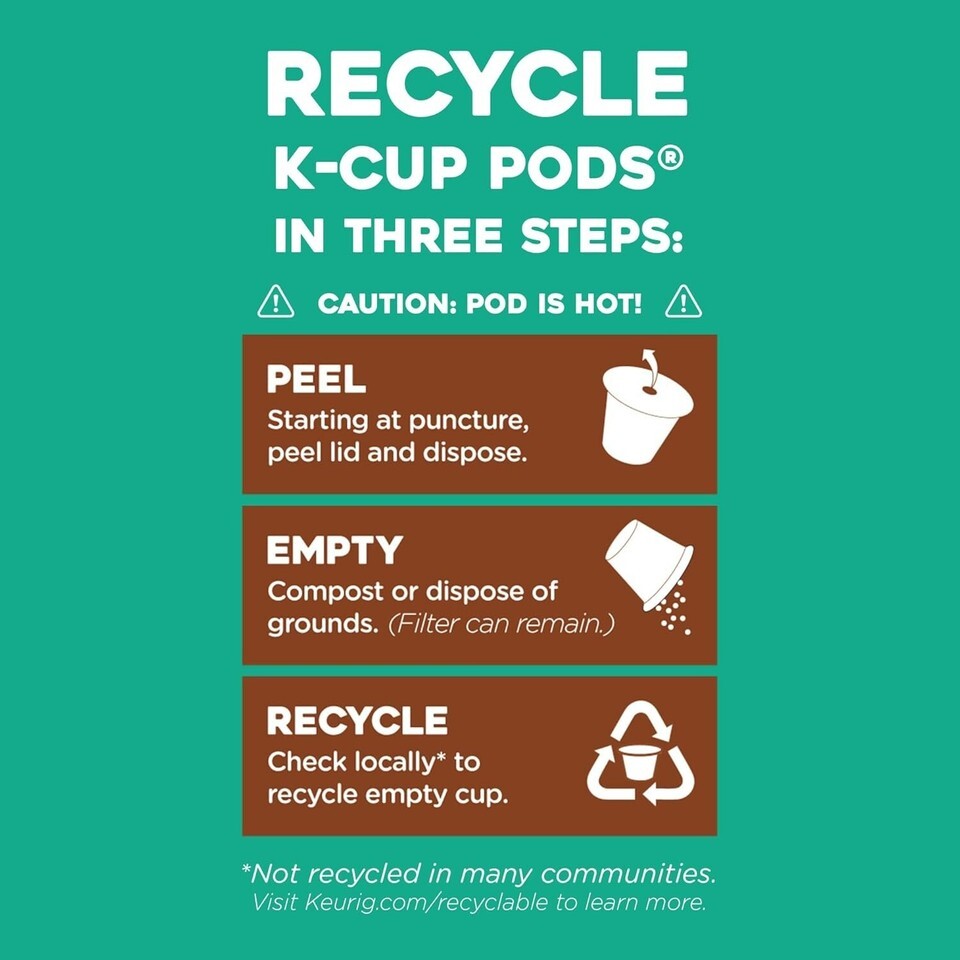 Simple, Delicious and Recyclable. Peel, empty, and recycle after use. Check locally, as not all communities recycle K-Cup pods.