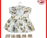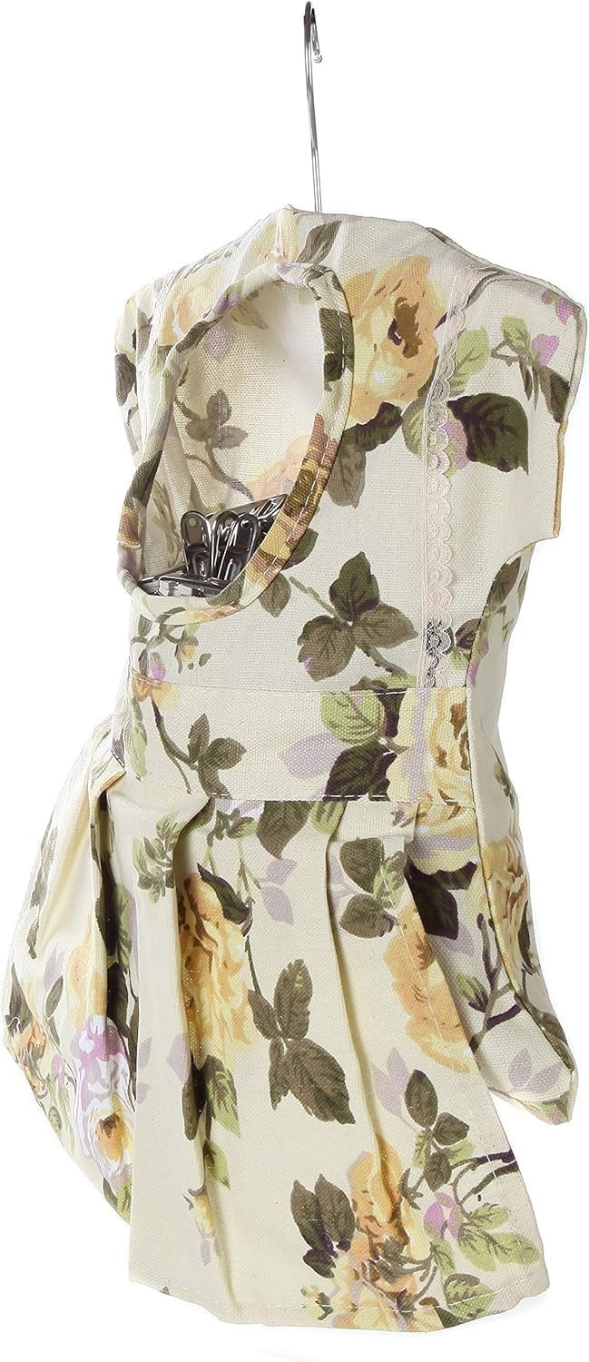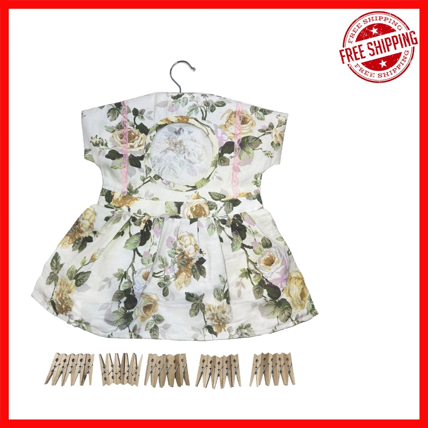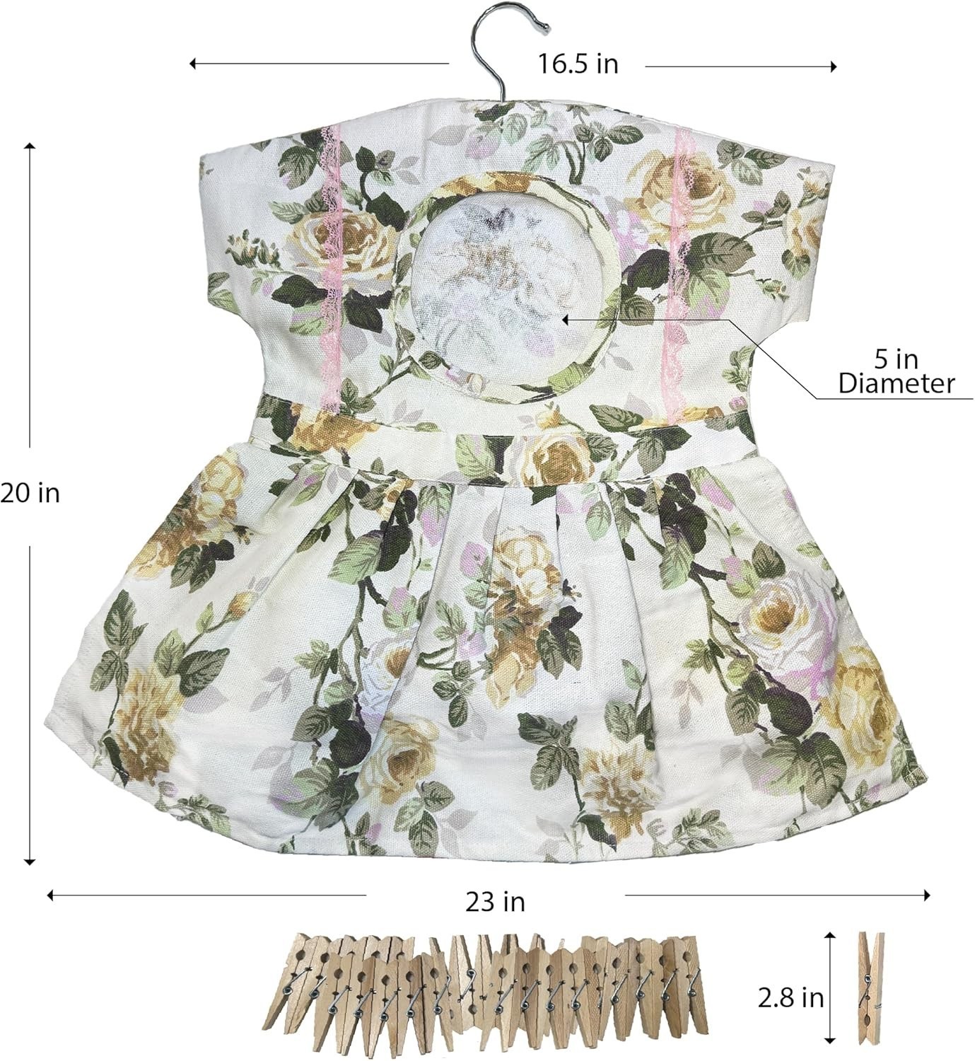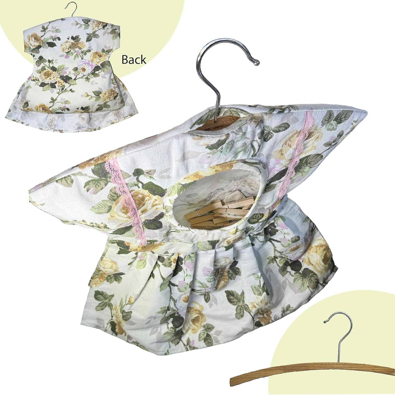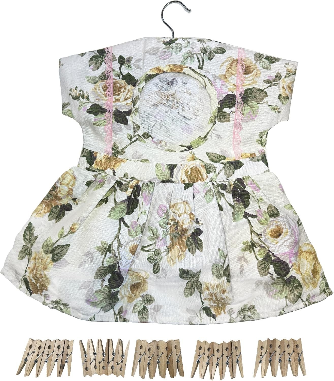 Features: Portable,Attached Wooden Hanger,Easy Maintenance,Charming Design,Floral-print dress,Pink lace trim,Practical Storage,Includes 25 wooden clothespins,Sturdy wooden hanger,Effortless hanging,Space-saving design,Keeps clothespins within,Gentle on clothes,Long-lasting performance,Durable construction,Spot clean maintenance