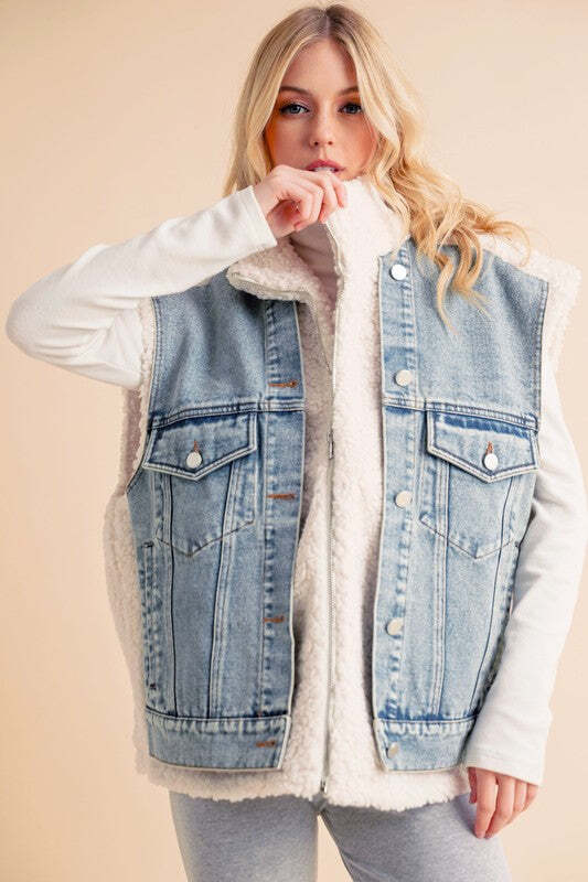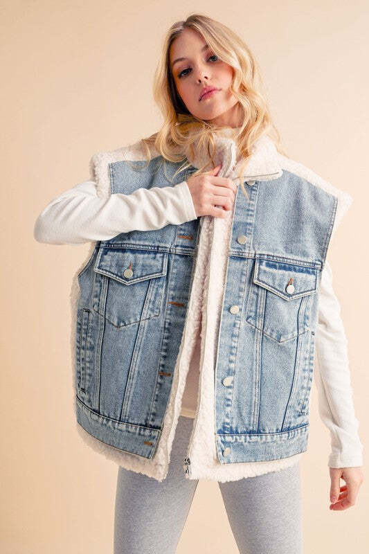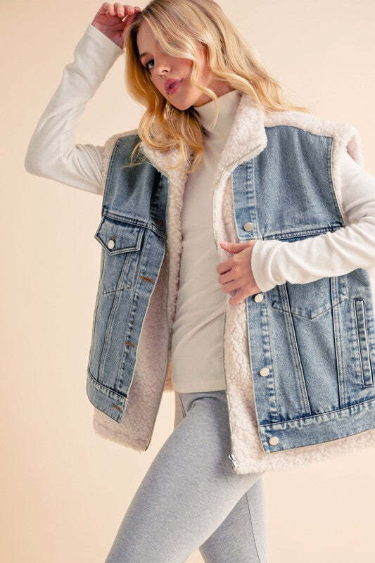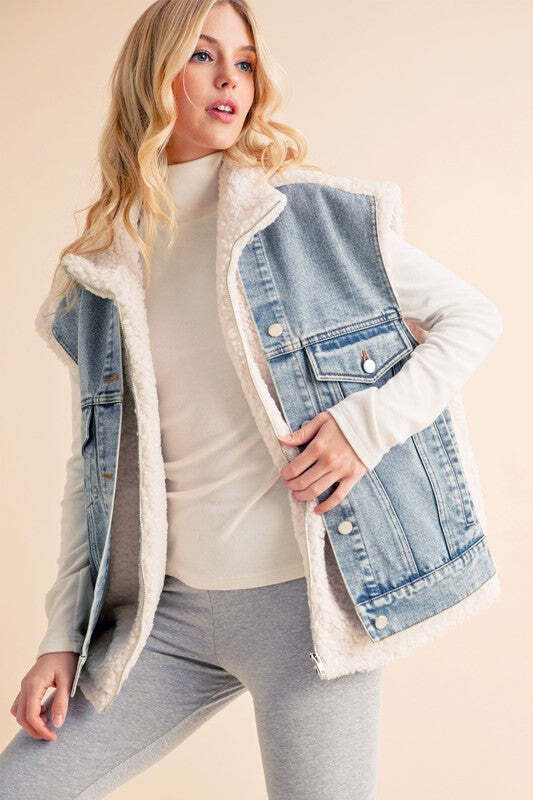 The Delli Vest is a must-have mixed media denim piece in a classic blue wash. Featuring front zippers and multiple functional pockets, it combines convenience with an iconic, effortless cool style. Timeless and practical, it's the perfect addition to any wardrobe.