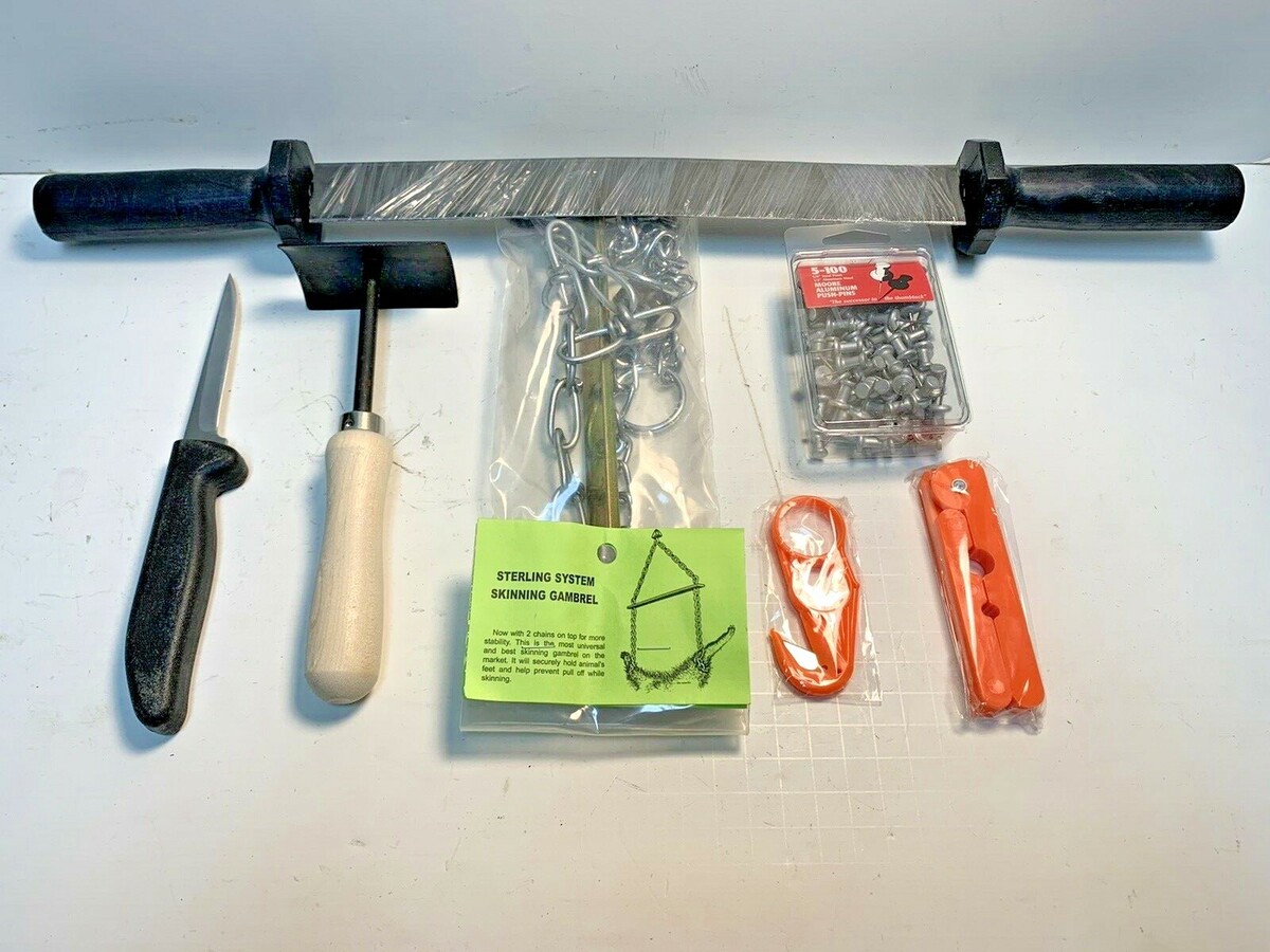 Up for sale is a deluxe fur handling/fur skinning kit. The kit contains a gambrel, skinning knife, tail stripper, tail zipper, fleshing tool, 12" fleshing knife, and 1 box of aluminum push pins.