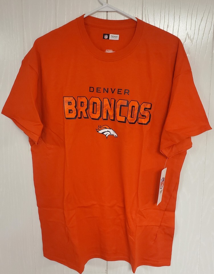 Officially Licensed Denver Broncos Team Apparel Orange T Shirt Screen print graphics 100% Cotton Machine Wash Cold, Inside Out Do Not Bleach Tumble Dry Low, Remove Promptly Do Not Dry Clean All items come from a smoke free and pet free environment and are in stock and ready to ship.