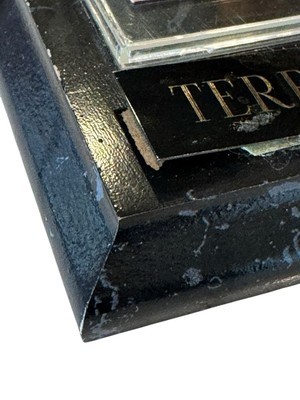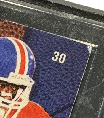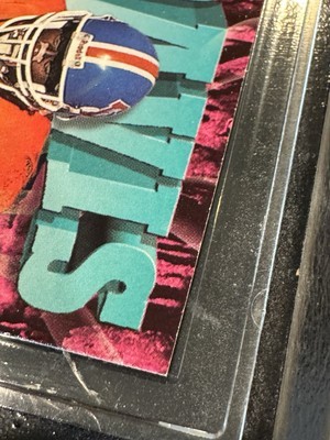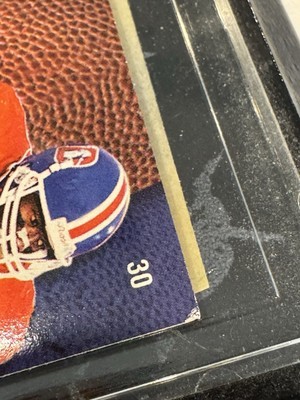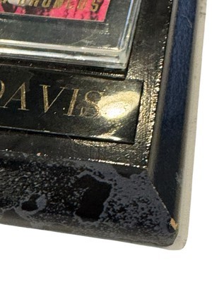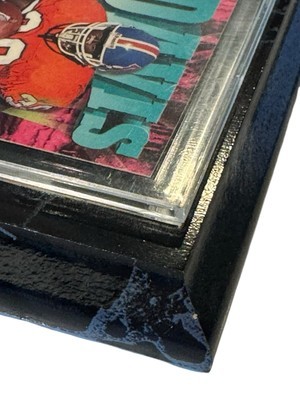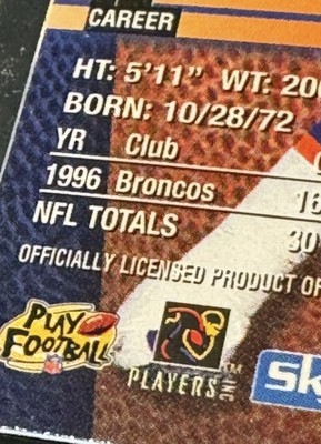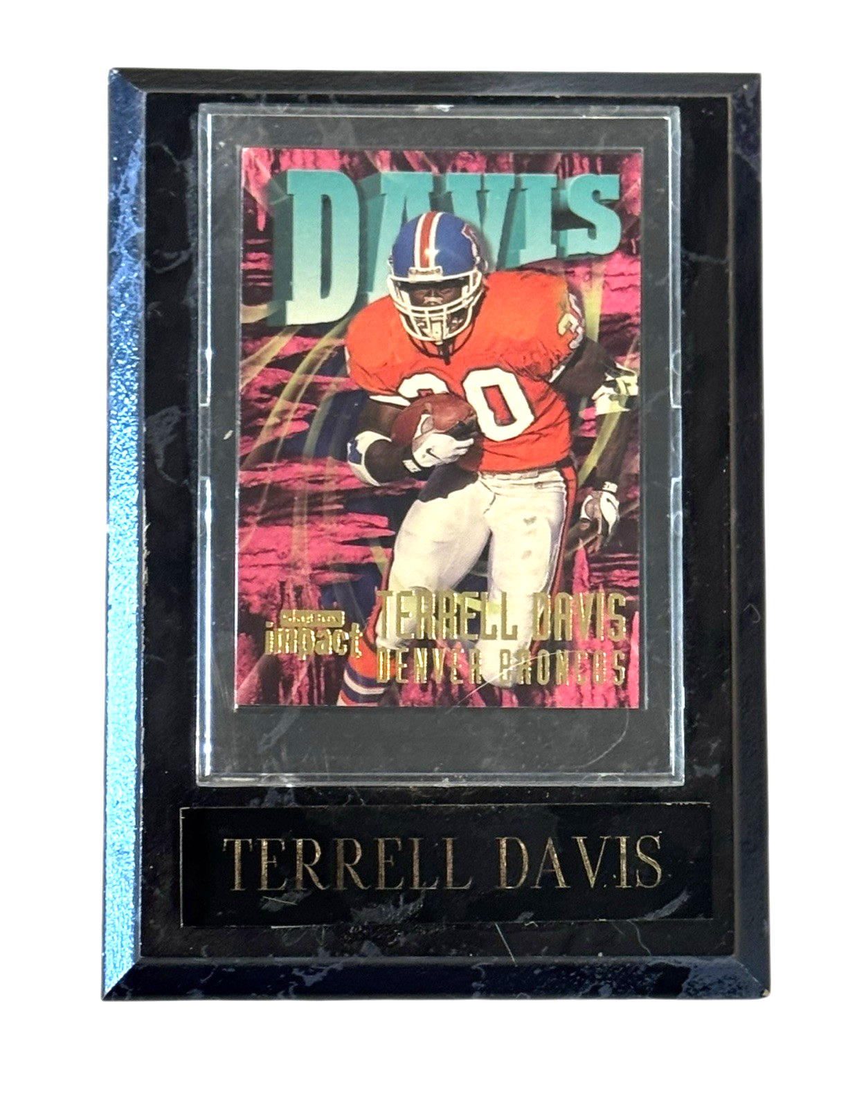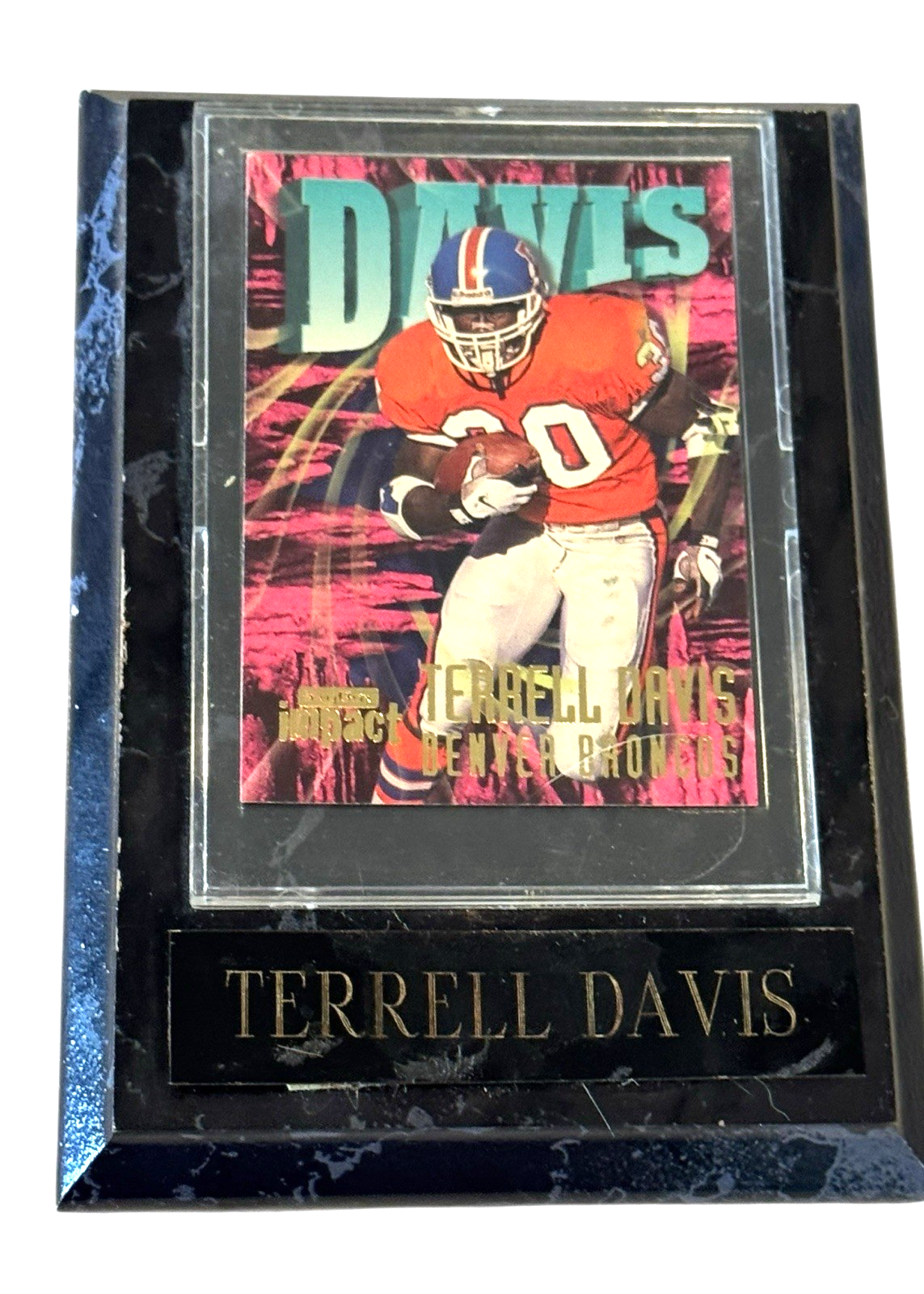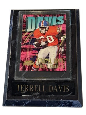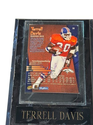 1997 Skybox Impact Football Card Featuring Terrell Davis, #30 Denver Broncos Card is mounted on a faux marble wood frame The plastic clear part has a removable cover Frame measures 6 x 4.25 inches The card itself is in very good condition with three corners having a tiny amount of wear. The wood "frame" piece has some issue: The plastic card holder has scratches and some cloudiness. The name plate is peeling off on one side and there is wear on some of the edges of the wood. The photos are useful for seeing condition and other details. Photos are of the actual item you will receive.
