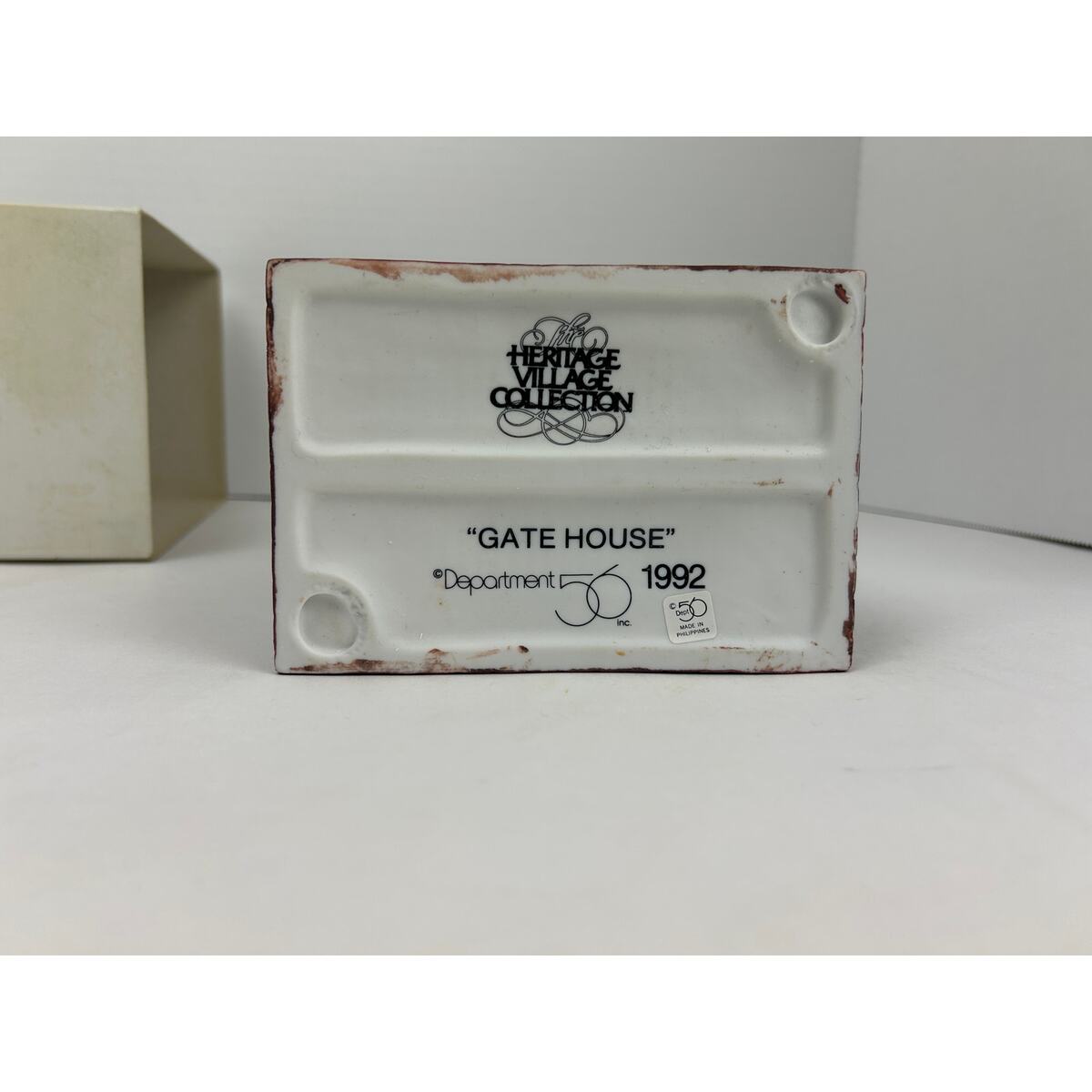 Gate House is a 1992 Dickens Village accessory from the Heritage Village Collection, designed as a stone archway with brick paving and a small rooms-over-gate structure above. The red roof, wreaths and lantern make it a perfect entry piece for a street of village buildings. ? Heritage Village Collection, Dickens Village accessory ? Gate House, item 55301, retired 1992 ? Includes original styrofoam box, outer sleeve, hang tag and booklet ? Hand painted porcelain with brick base, stone arches and holiday garlands ? No chips, cracks or repairs seen; colors strong, edges and corners crisp ? Light shelf and storage wear to outer box ? Approximate size about 5 in long, 3.5 in wide, 6.25 in tall