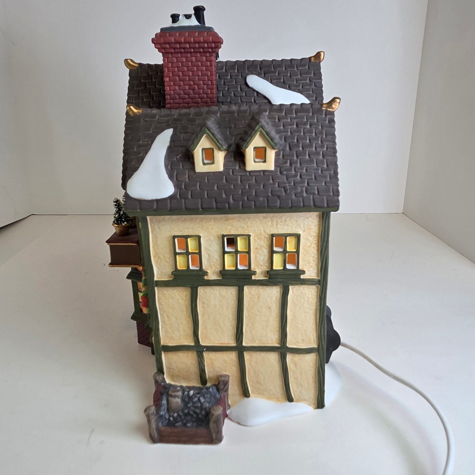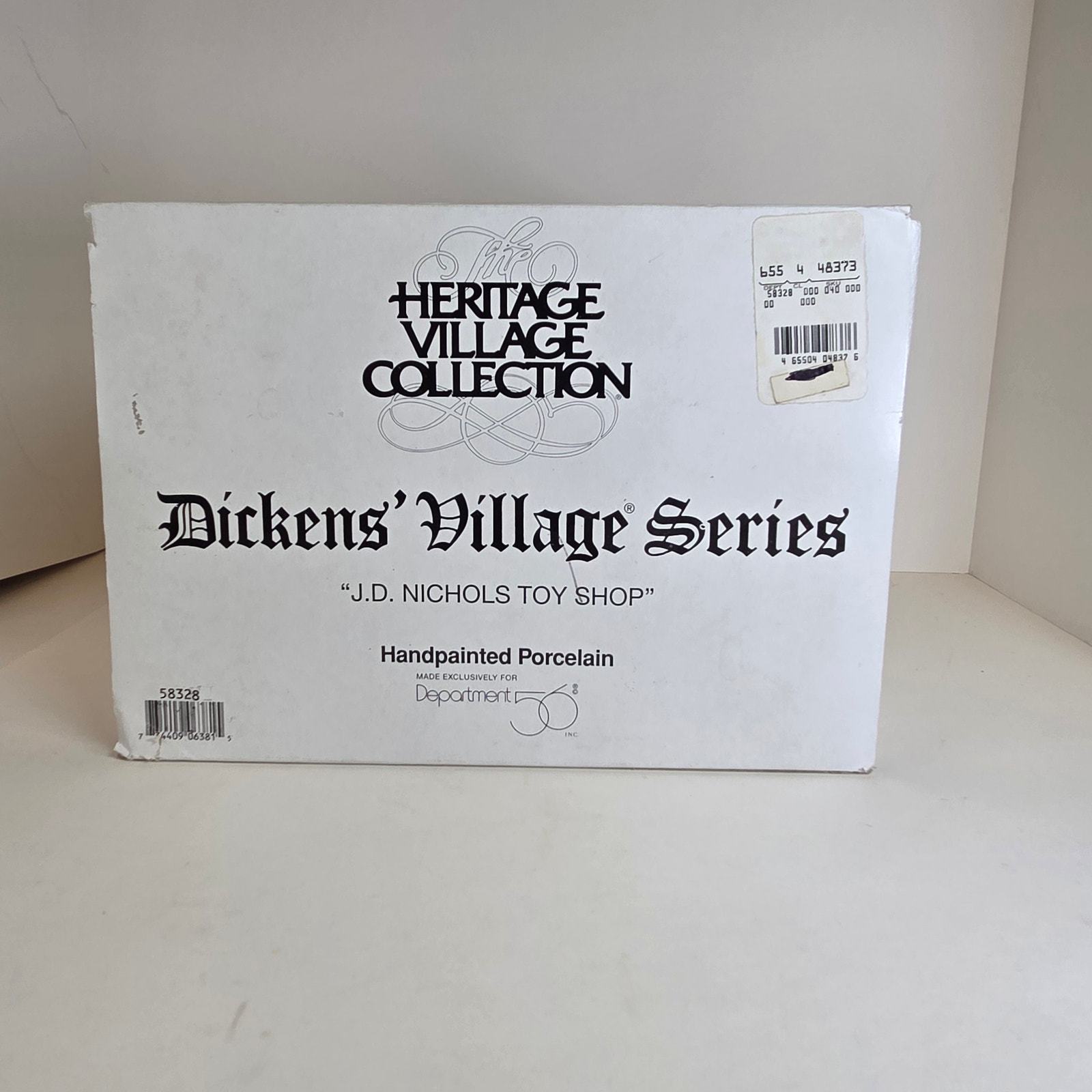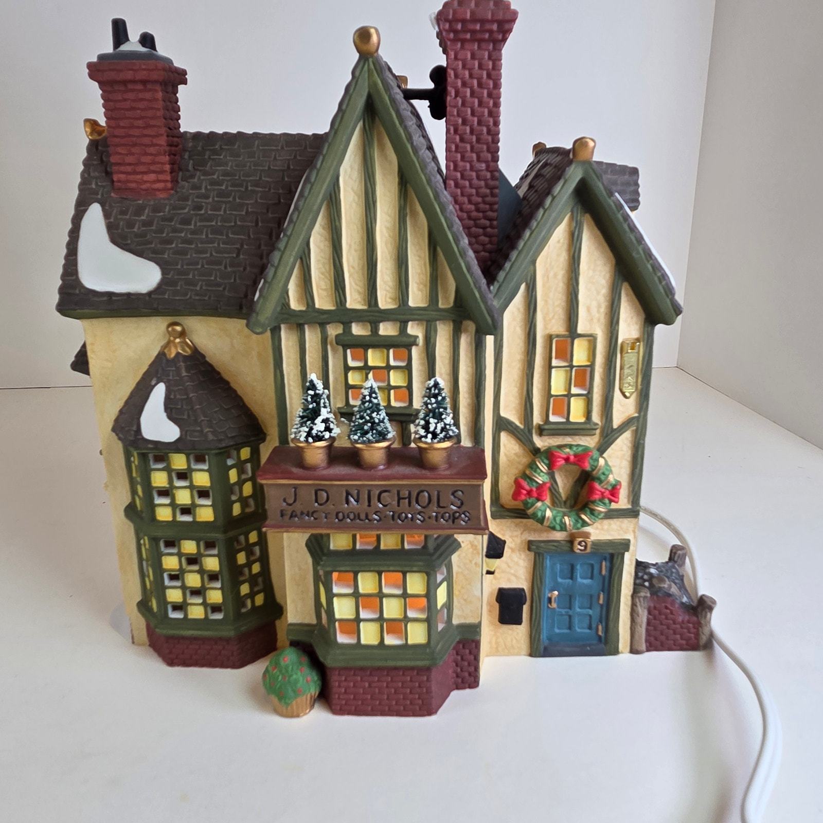 Add Victorian charm to your holiday village with this JD Nichols Toy Shop from the Dickens' Village Series by Department 56. This lighted ceramic building features colorful detailing, frosted windowpanes, and classic 19th-century architecture. Comes in the original box with styrofoam insert for safe storage or gifting. Series: Dickens' Village Series Model: JD Nichols Toy Shop Material: Porcelain / ceramic with hand-painted details Year Introduced: 1994 Includes: Lighted building, cord, original box and styrofoam Dimensions: Approx. 6.5? tall x 5.25? wide x 4? deep Condition: Excellent pre-owned condition; light tested and working. Box shows minor wear from storage.