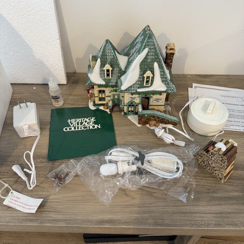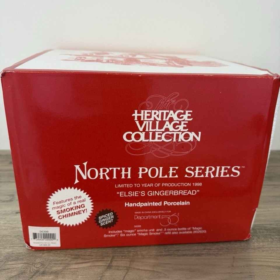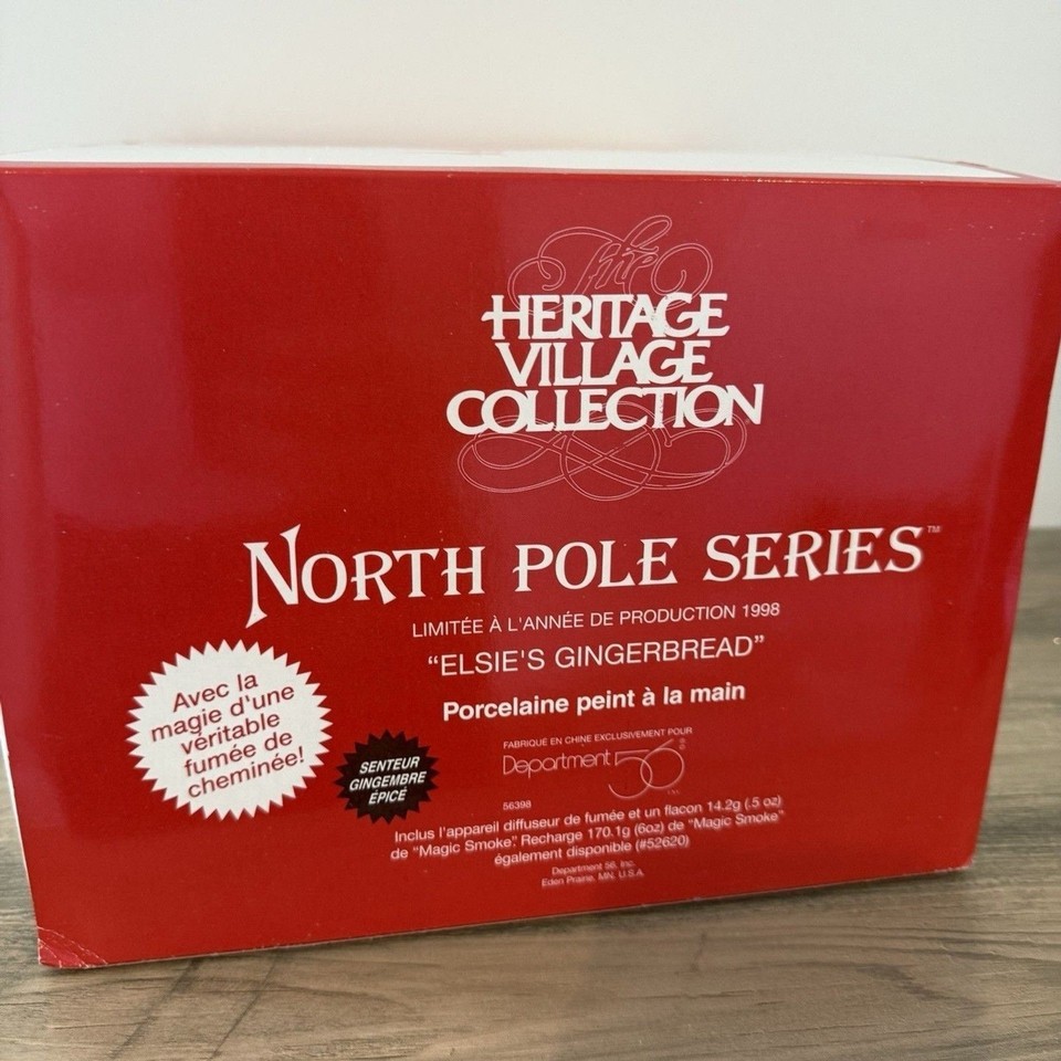 New in Open Box Department 56 / Heritage Village Collection / North Pole Series "Elsie's Gingerbread" Rare, retired Handpainted Porcelain, Smoking Chimney, Spiced Ginger Scent Item number 56398 Comes with all pieces and original box See photos for more information No returns as this is a seasonal, fragile item Feel free to reach out with any questions